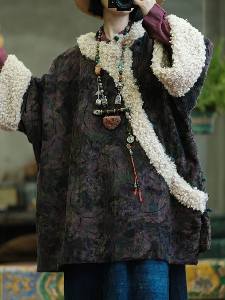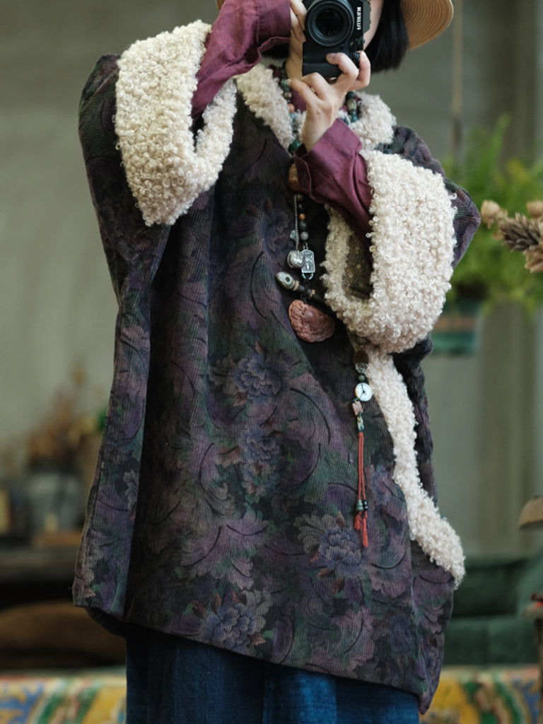Women Vintage Winter Flower Fleece Spliced O-Neck Corduroy Coat