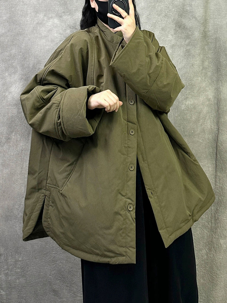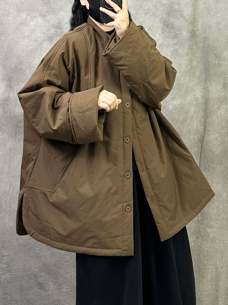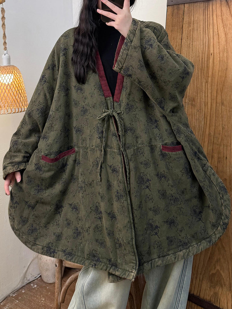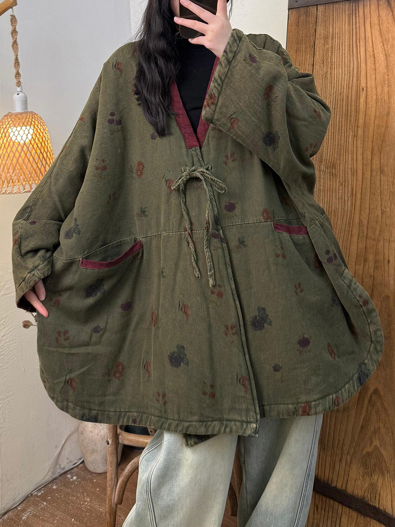 Women Vintage Winter Flower V-Neck Corduroy Padded Coat