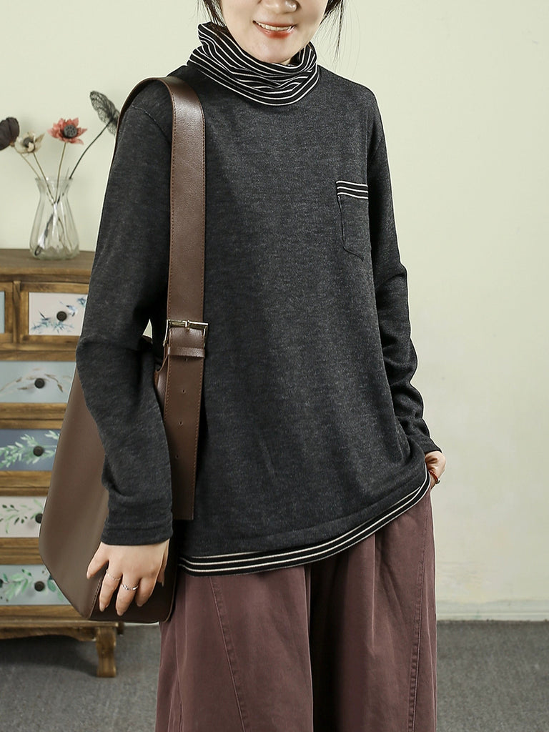 Women Winter Stripe Spliced Turtleneck Fleece-lined Blouse