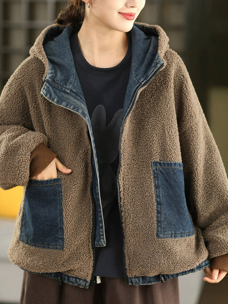 Women Winter Dual-side Wearing Fleece Denim Hooded Coat