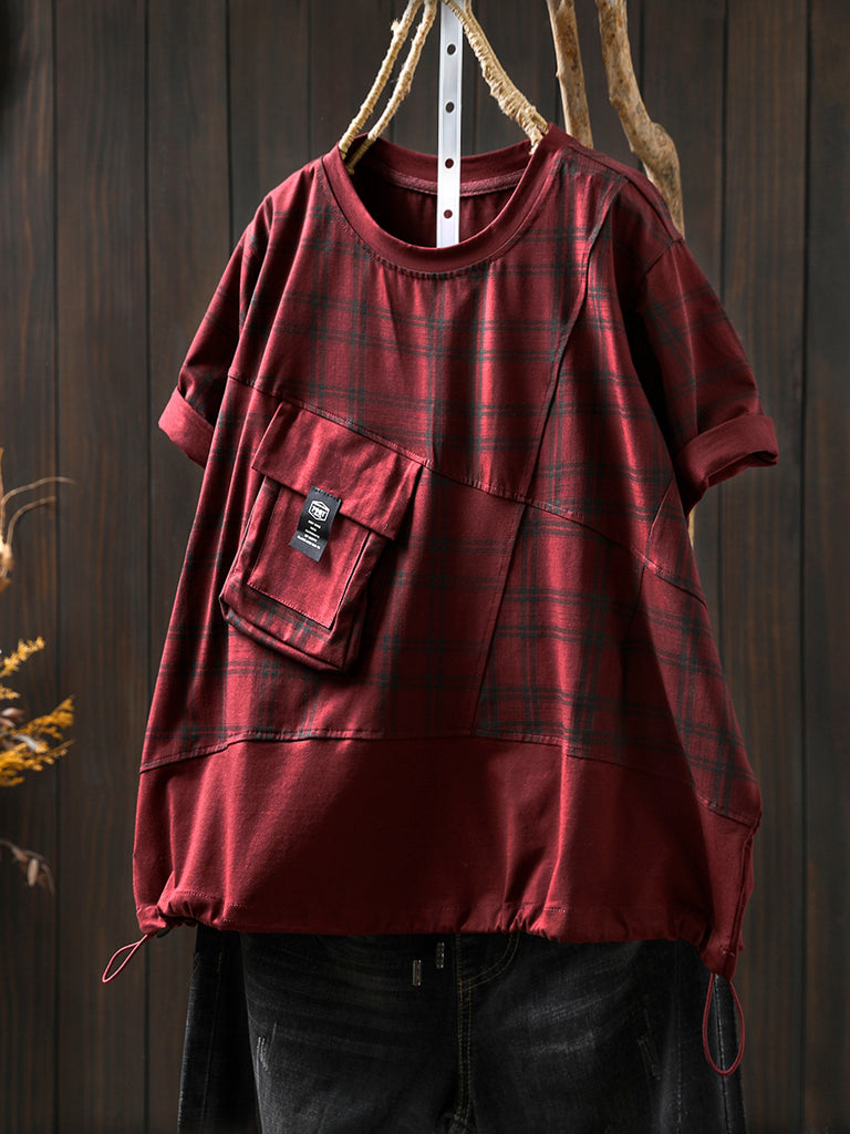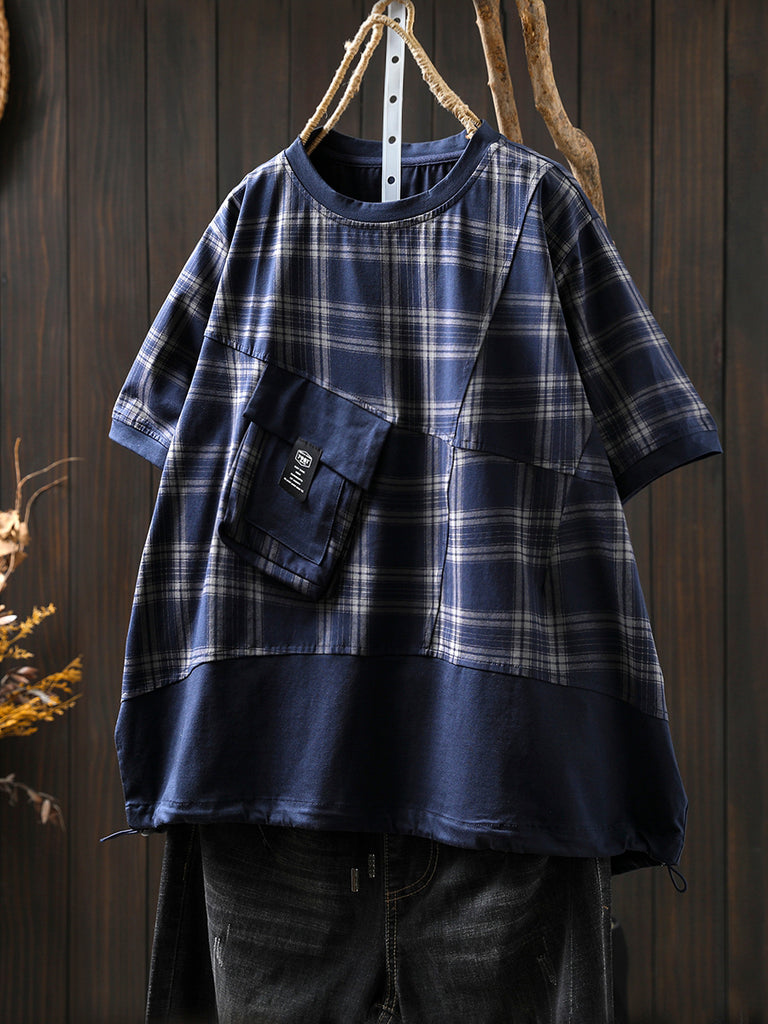 Women Summer Retro Colorblock Plaid O-Neck Cotton Shirt