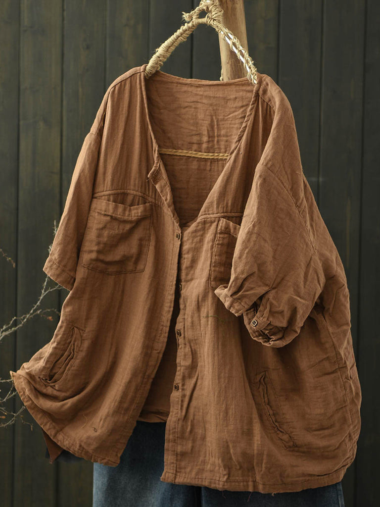Plus Size Women Vintage Pure Color O-Neck Ramie Shirt