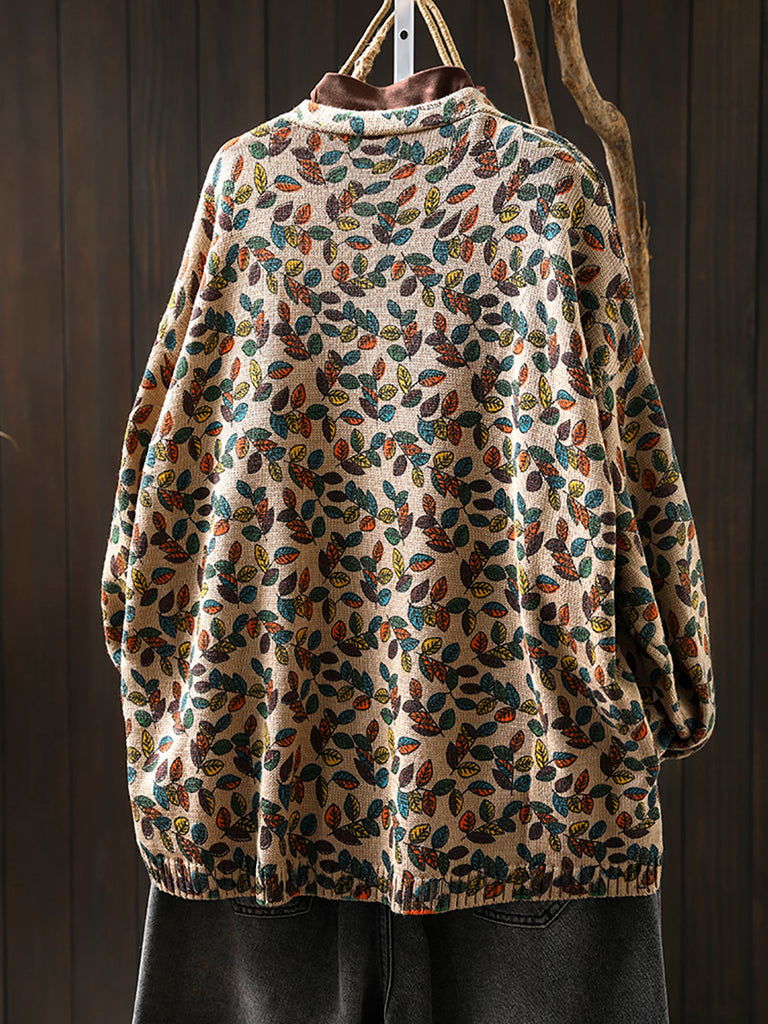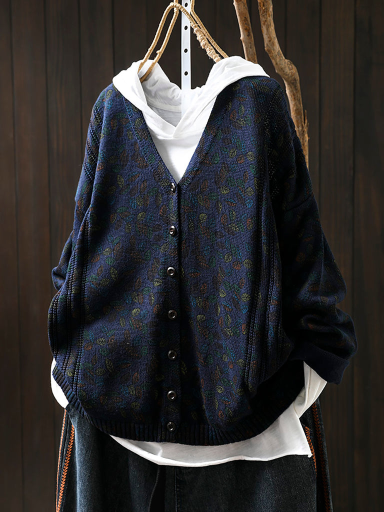 Women Autumn Leaf Knitted V-Neck Cardigan Sweater