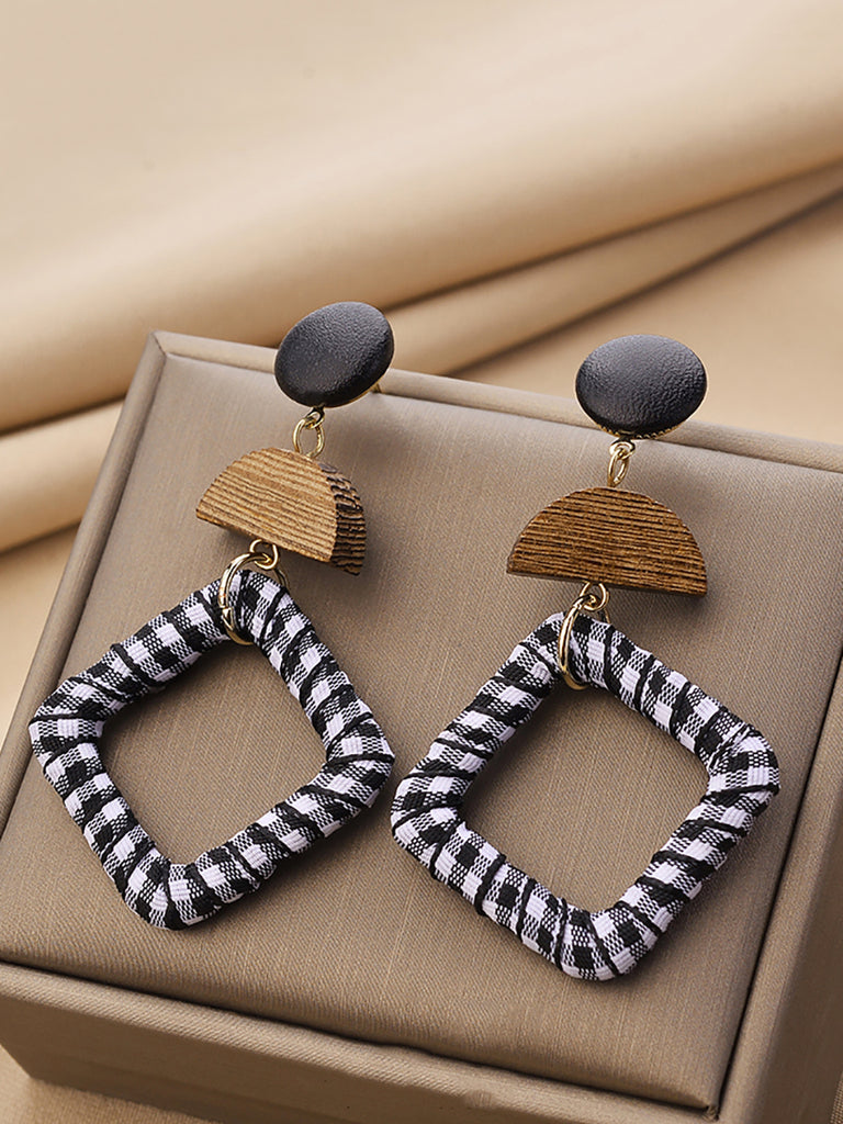 Women Ethnic Wooden Cloth Square S925Silver Earrings