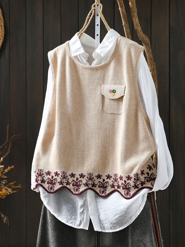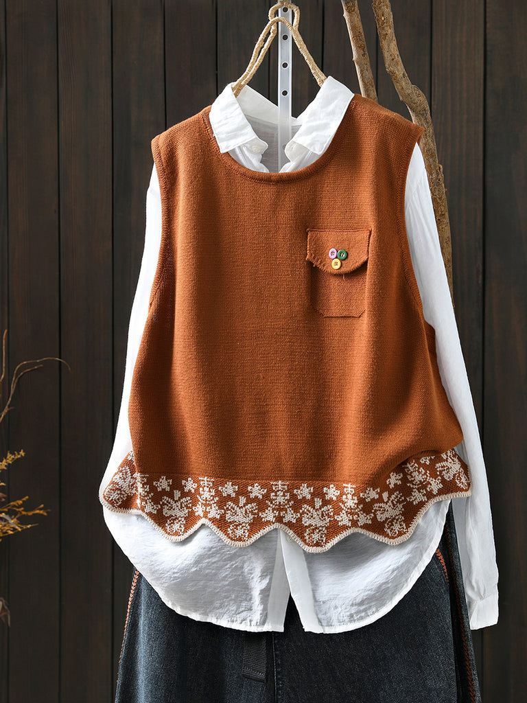Women Autumn Artsy Wave Hem O-Neck Knitted Vest