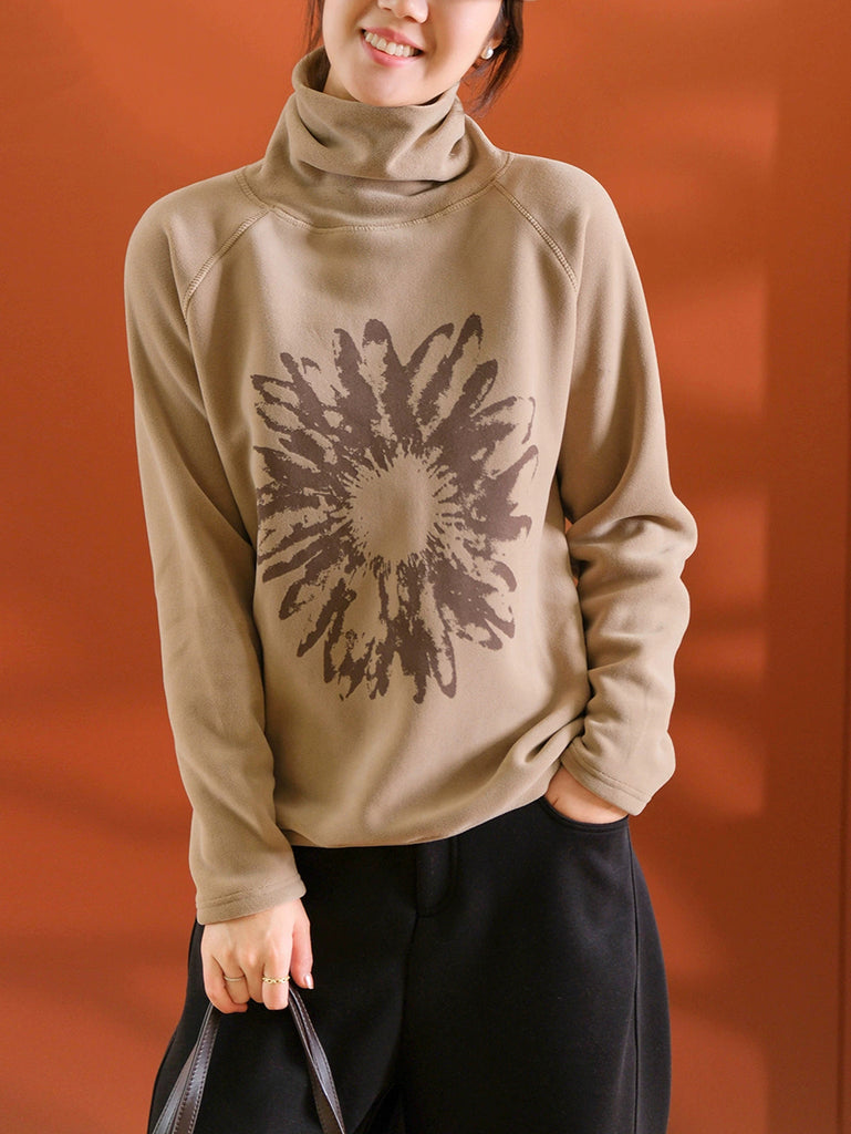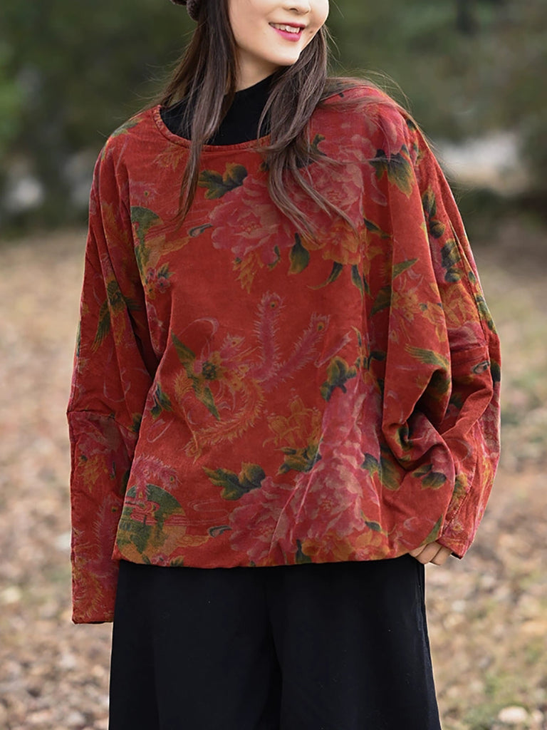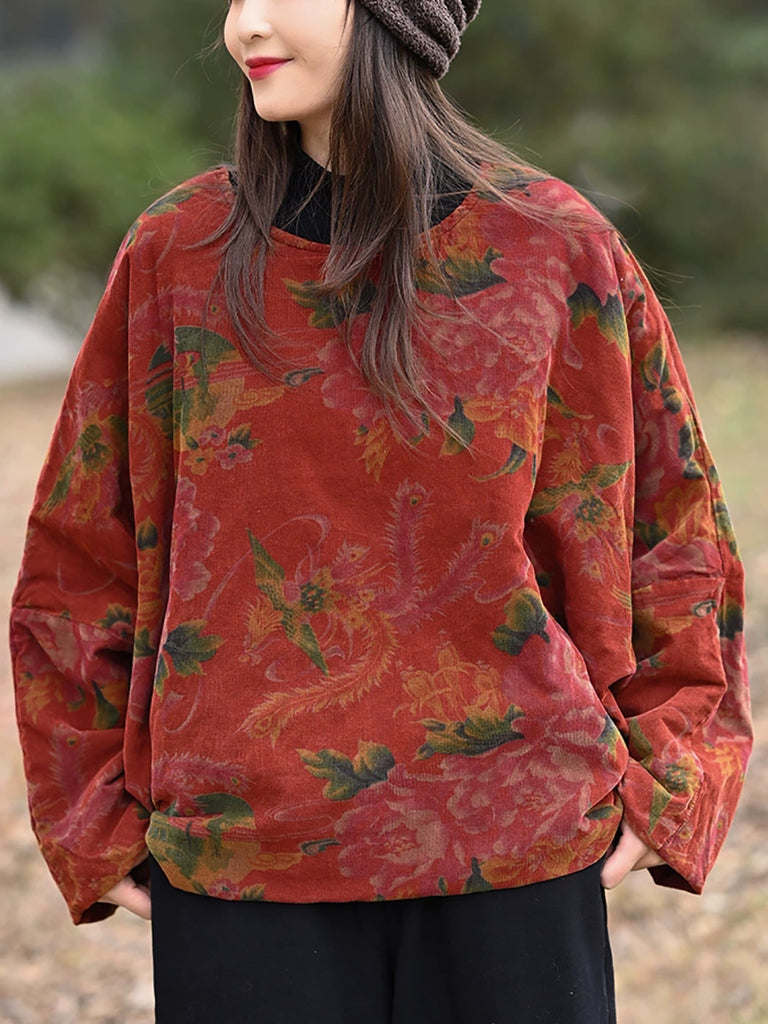 Women Winter Artsy O-Neck Floral 100%Cotton Blouse