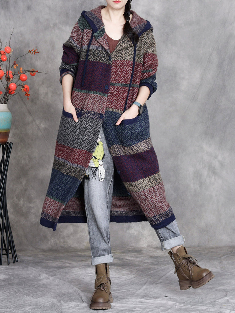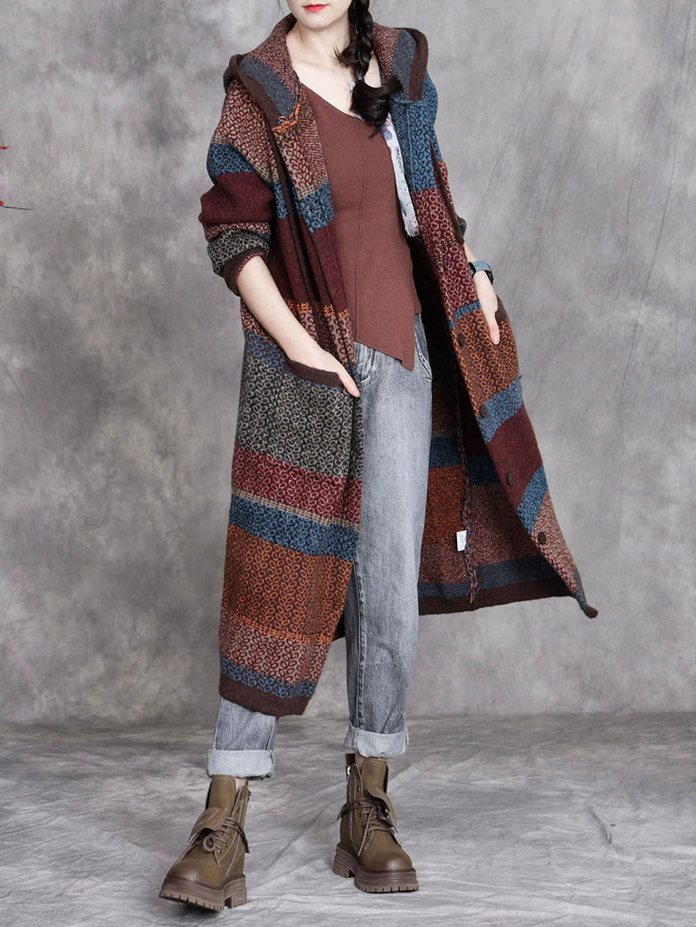 Women Retro Winter Colorblock Knitted Hooded Wool Coat