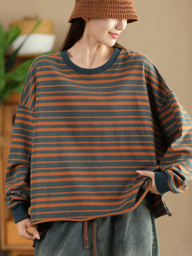 Women Autumn Casual Stripe O-Neck Cotton Shirt
