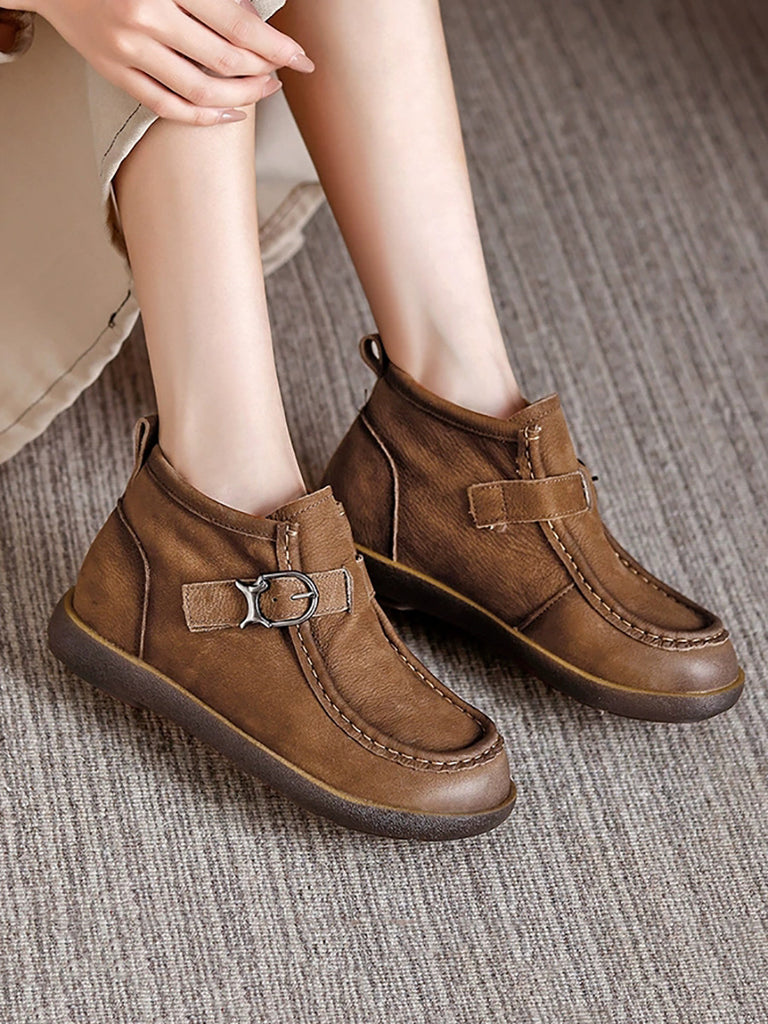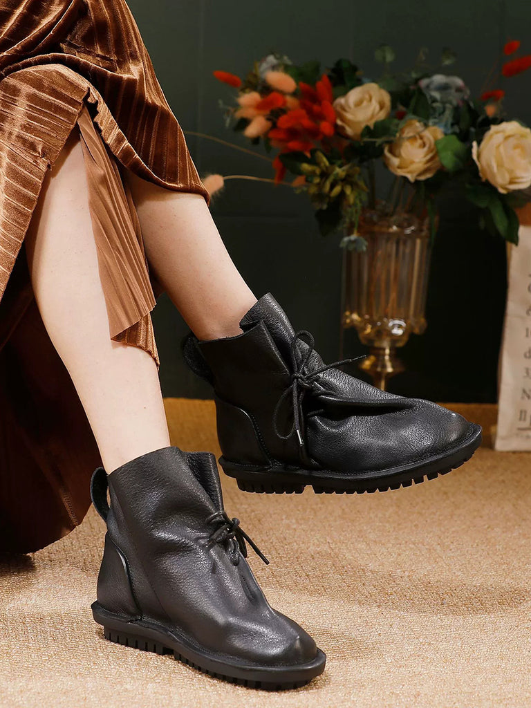Women Winter Vintage Pure Color Leather Flat Ankle Boots