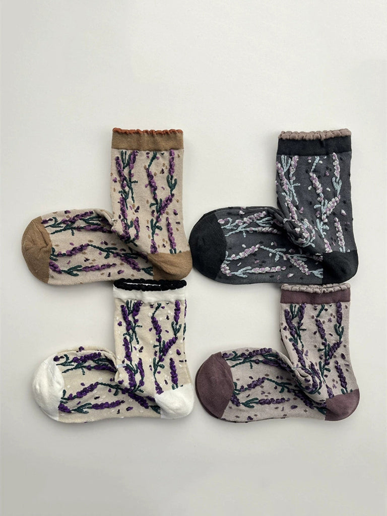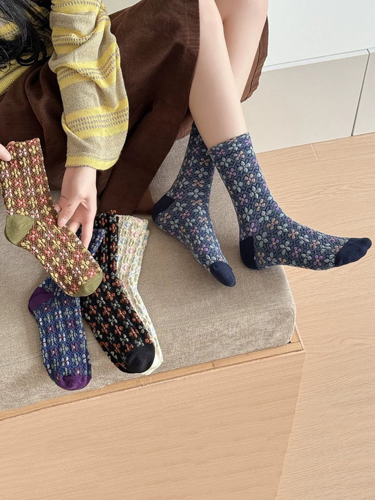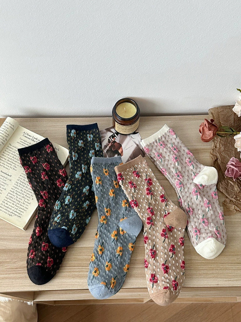 5 Pairs Women Artsy Flower Jacquard Cotton Socks