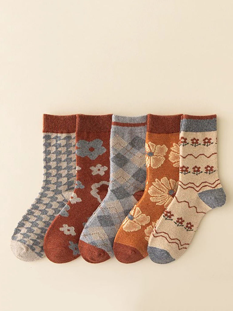 5 Pairs Women Vintage Autumn Jacquard Cotton Socks