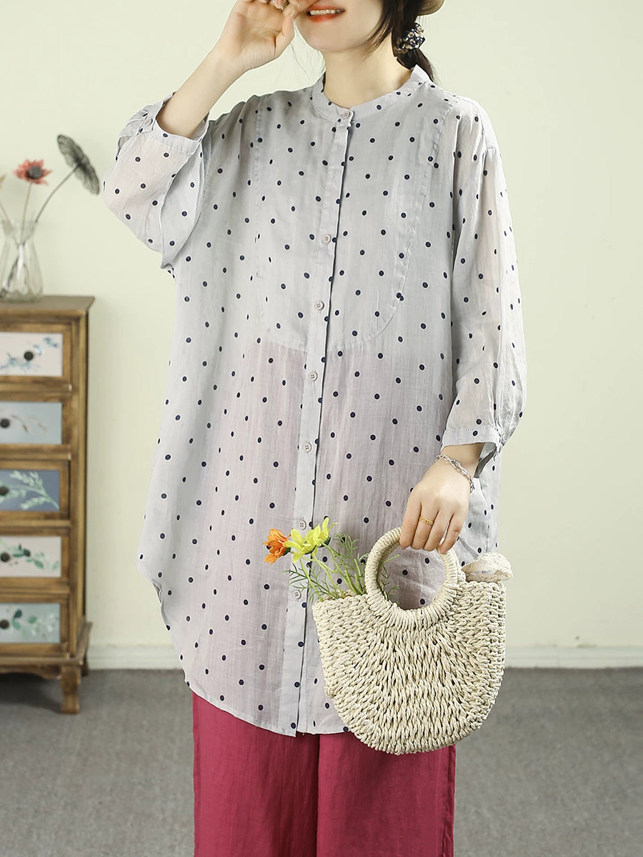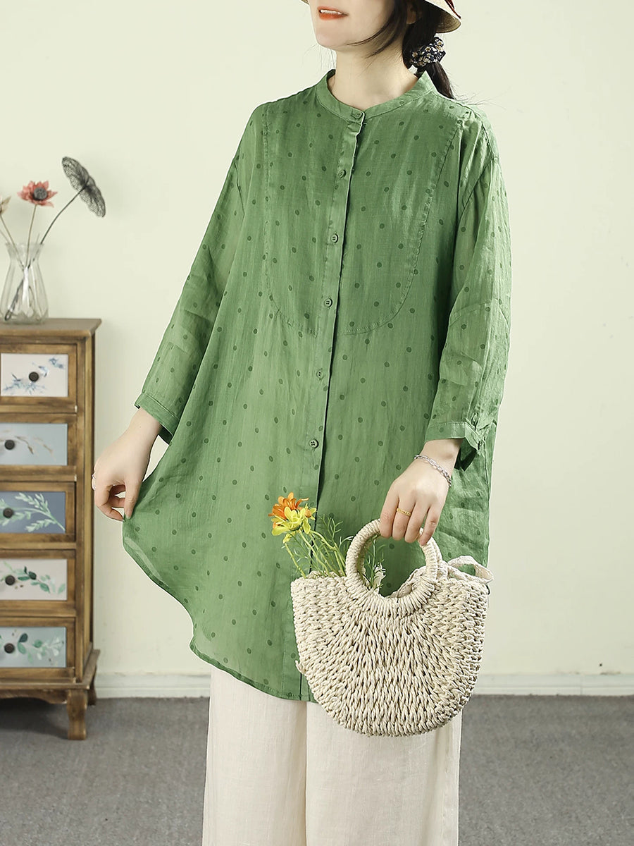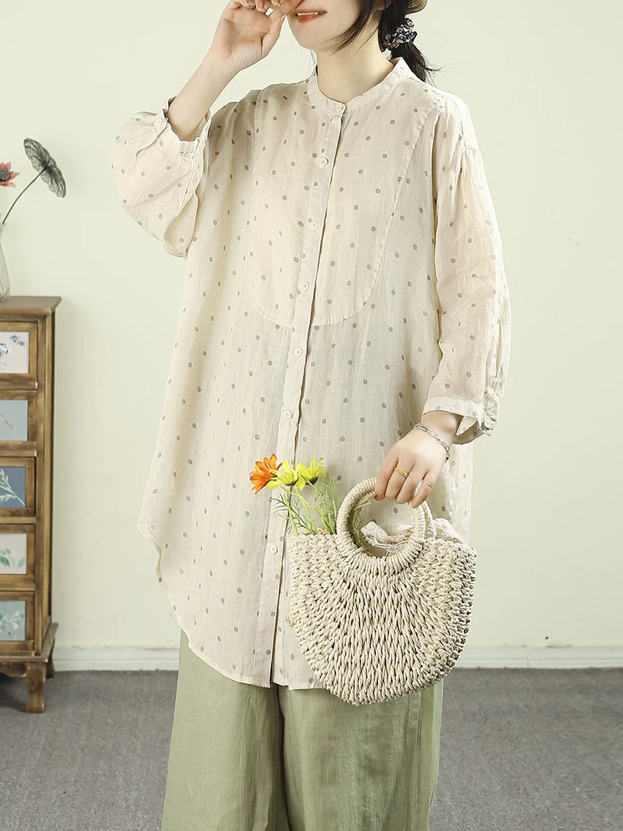 Women Artsy Spring Dot Stand Collar 100%Ramie Blouse