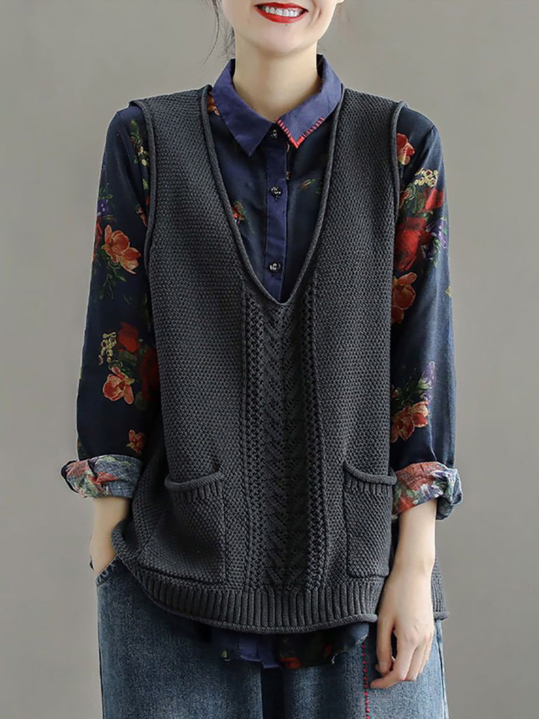 Plus Size Women Pocket Knitted Hollow Sweater Vest