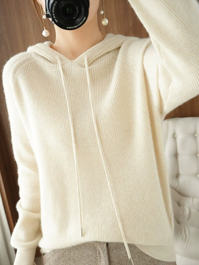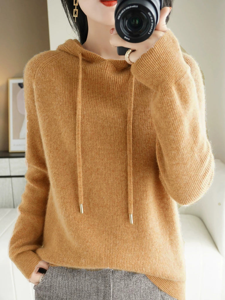 Women Autumn Casual Pure Color Knitted Hooded Sweater