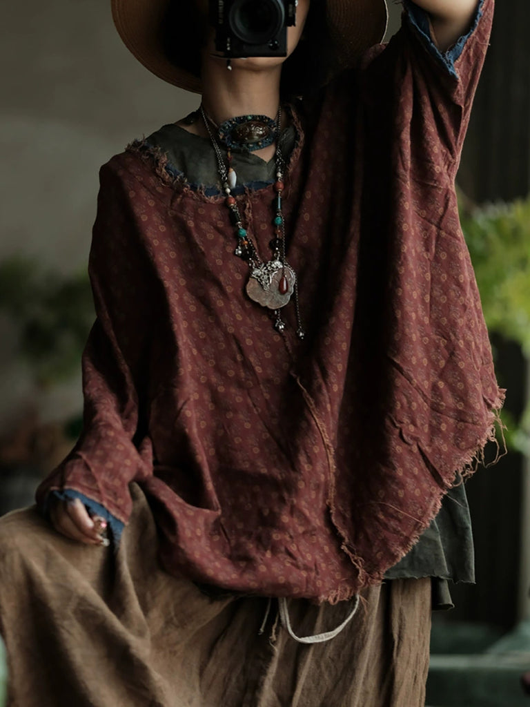 Women Autumn Retro Print O-Neck Raw-edge Cotton Shirt
