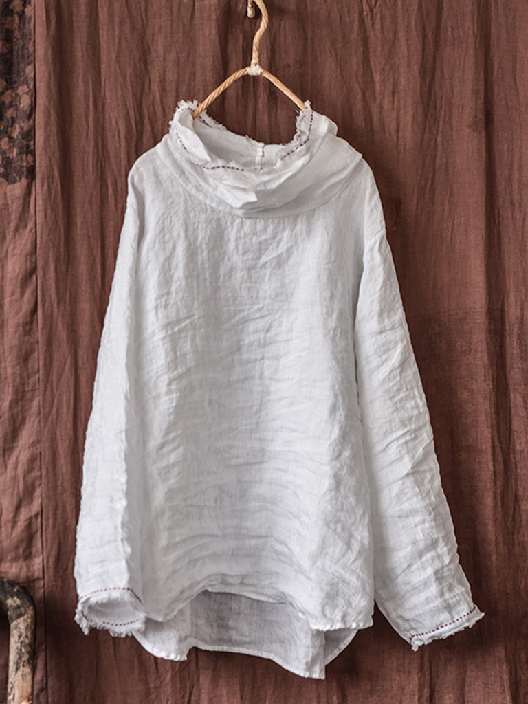 Women Autumn Vintage Pure Color Hooded Linen Shirt