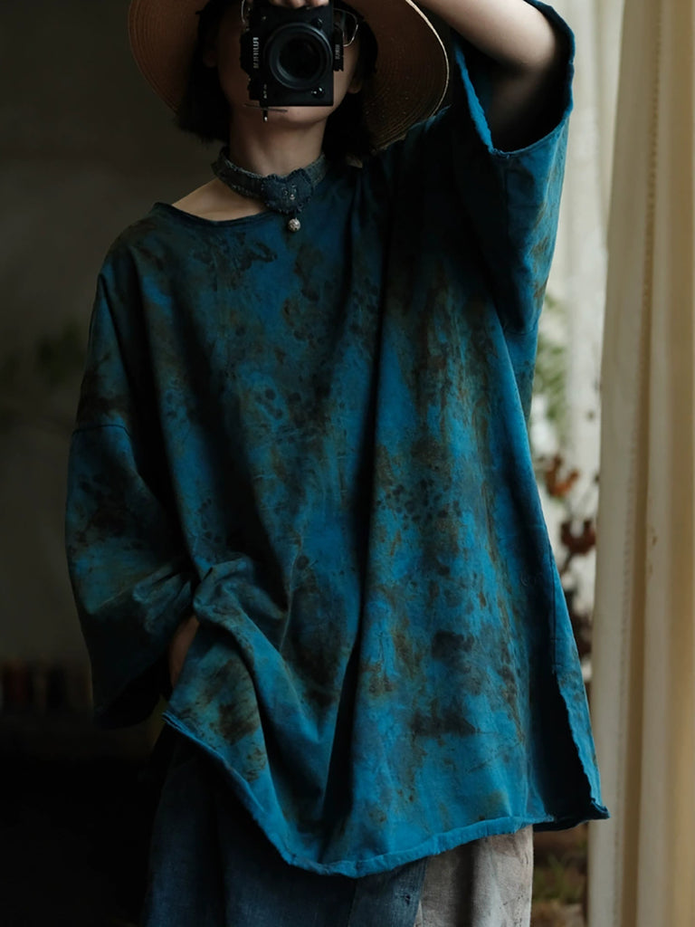 Women Autumn Vintage O-Neck Tie-dye Cotton Shirt