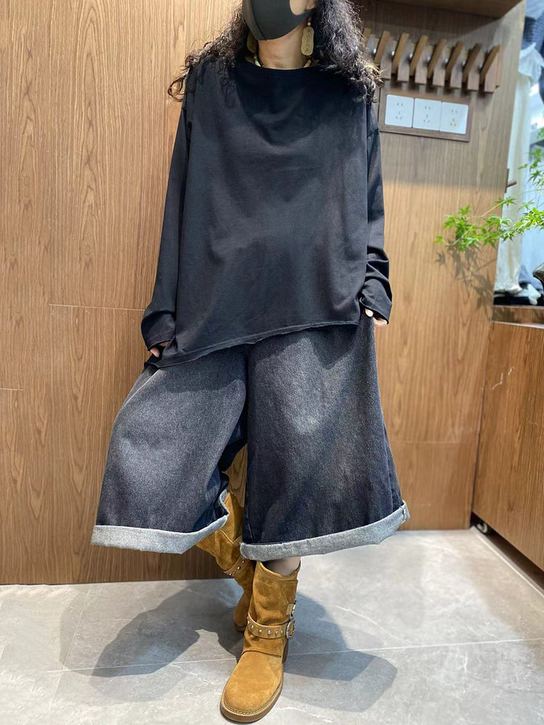 Plus Size Women Autumn Casual Pure Color 100%Cotton O-Neck Shirt