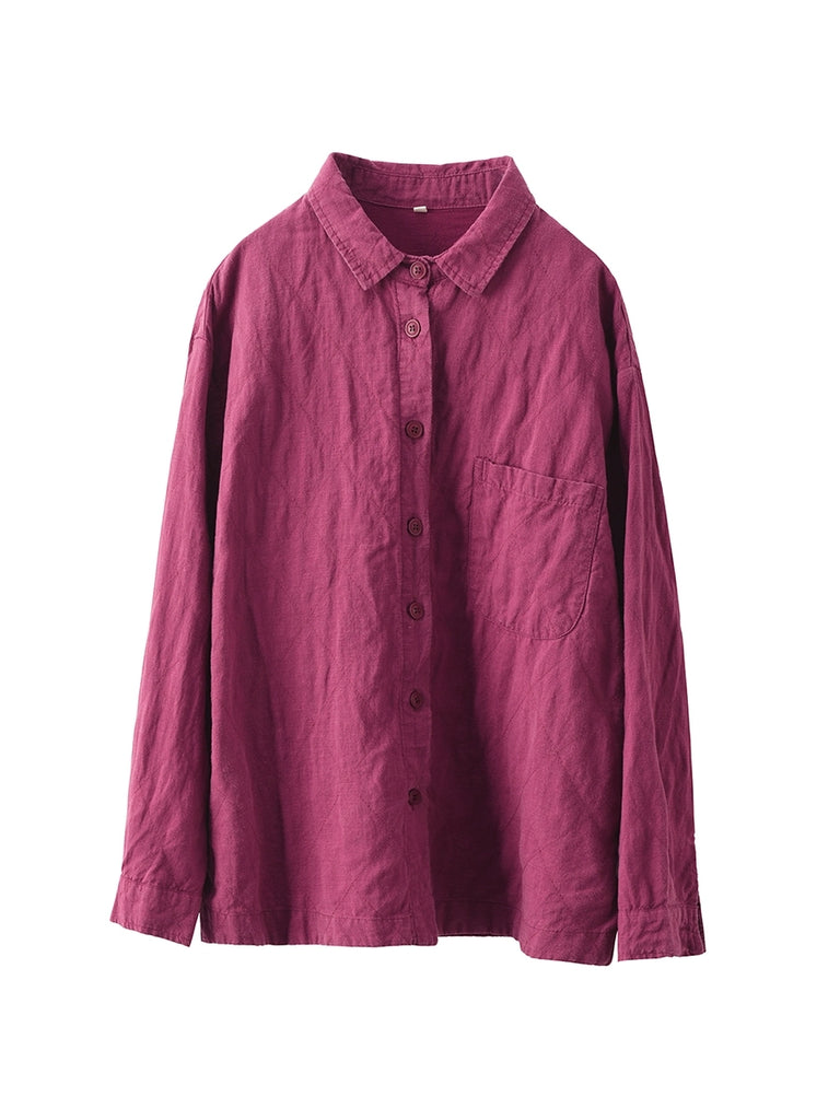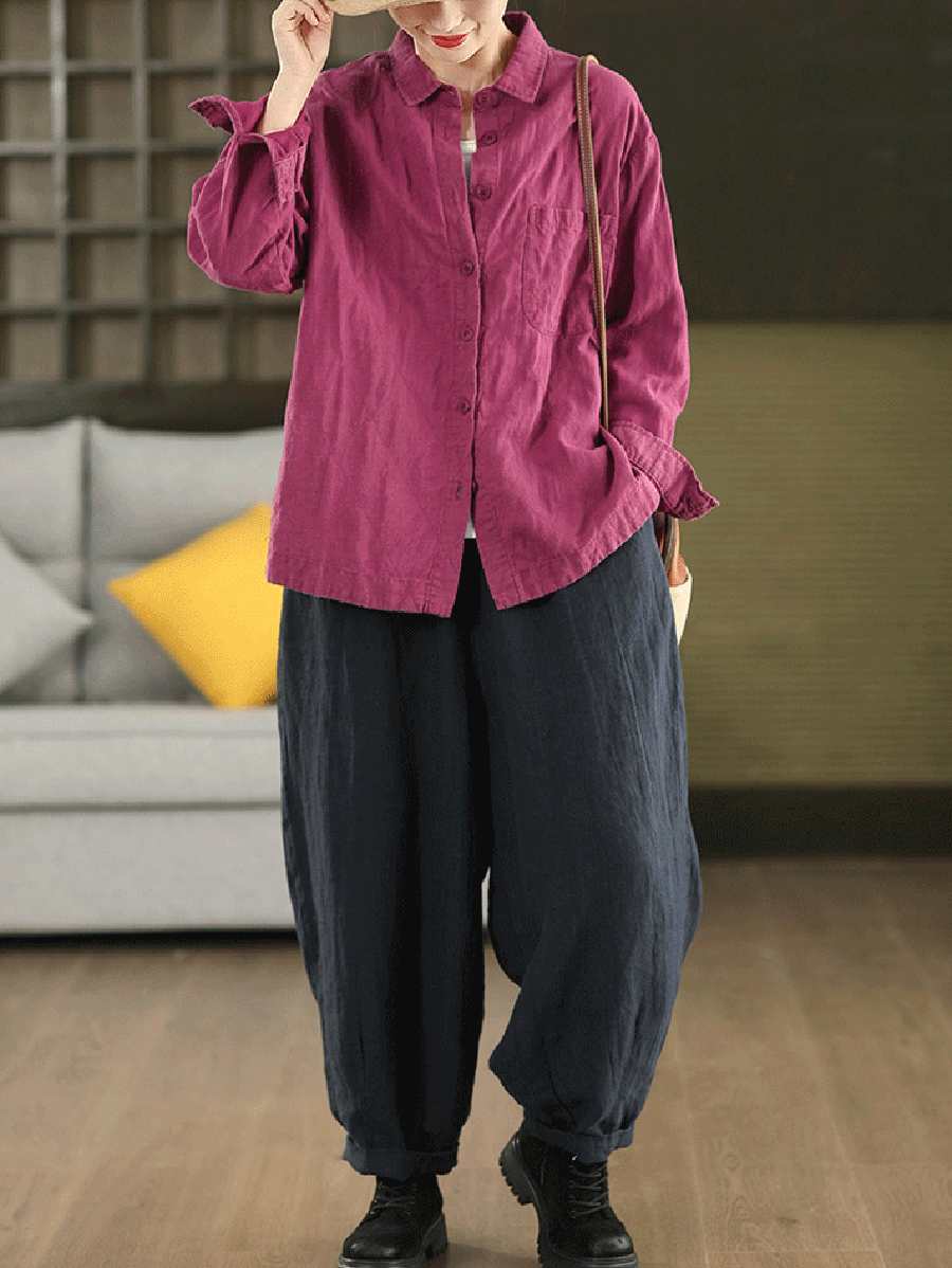 Women Autumn Pure Color 100%Linen Turn-down Collar Shirt