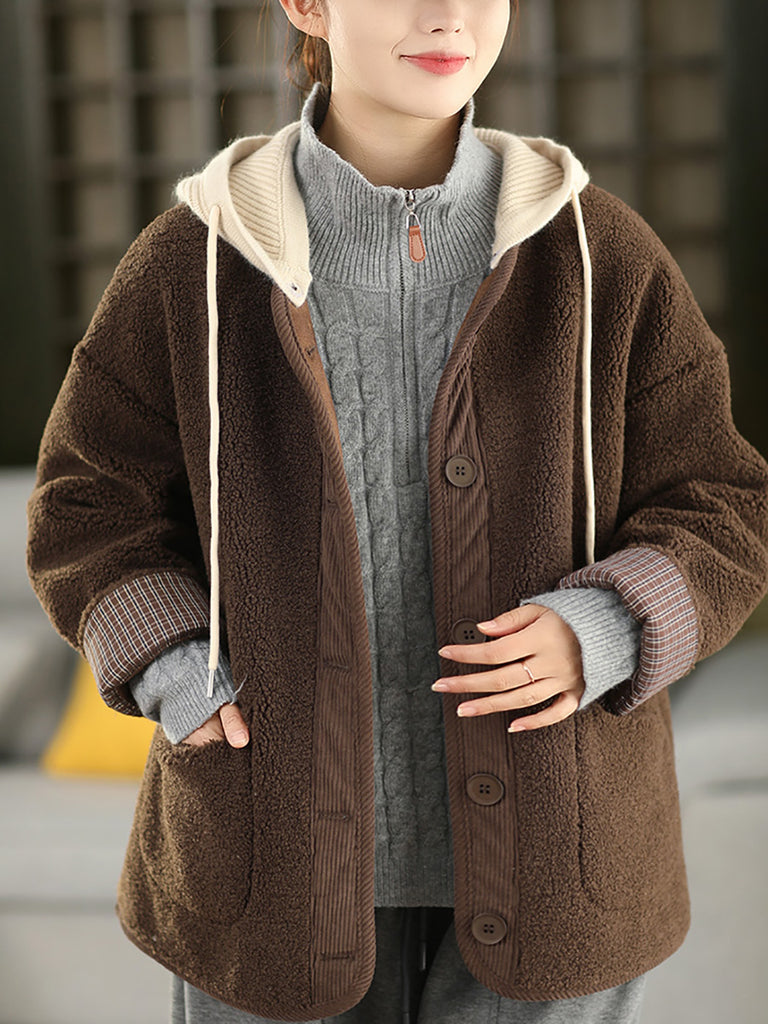 Women Autumn Retro Colorblock Hooded Sweater Coat