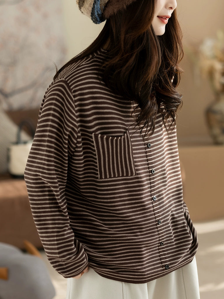 Women Vintage Autumn Stripe Stand Collar Blouse