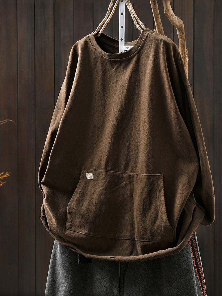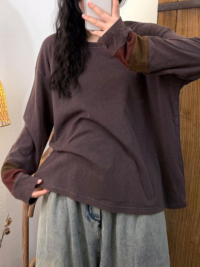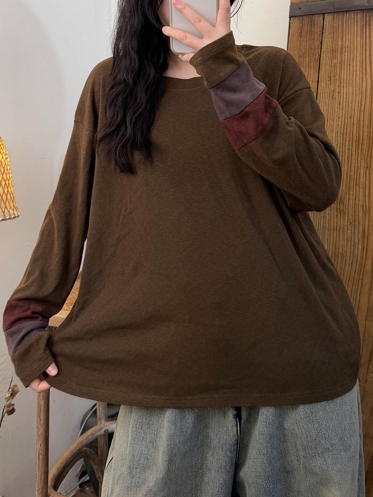 Women Vintage Autumn Colorblock O-Neck Cotton Blouse
