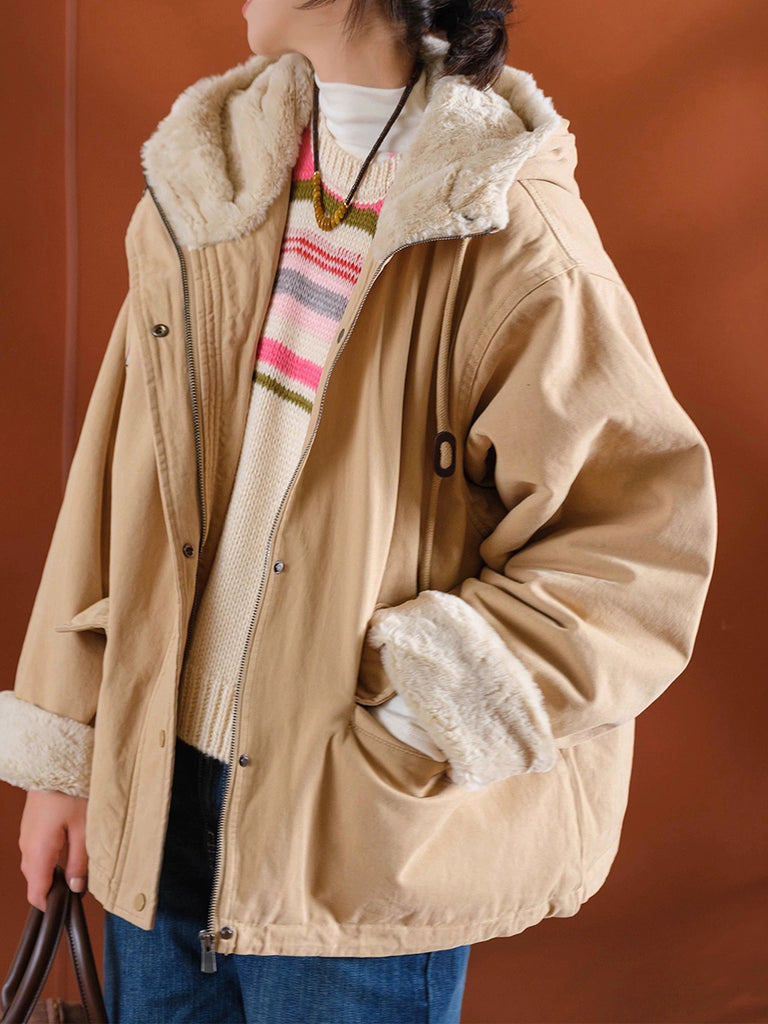 Women Winter Casual Pure Color Fleece-lined Hooded Coat