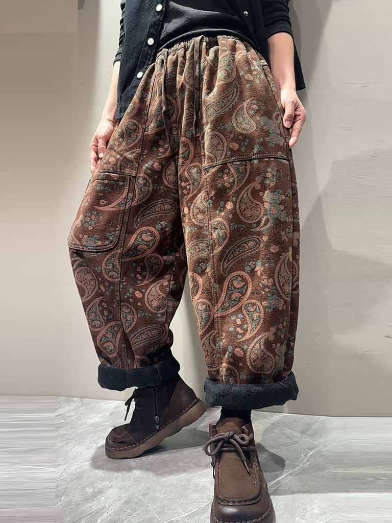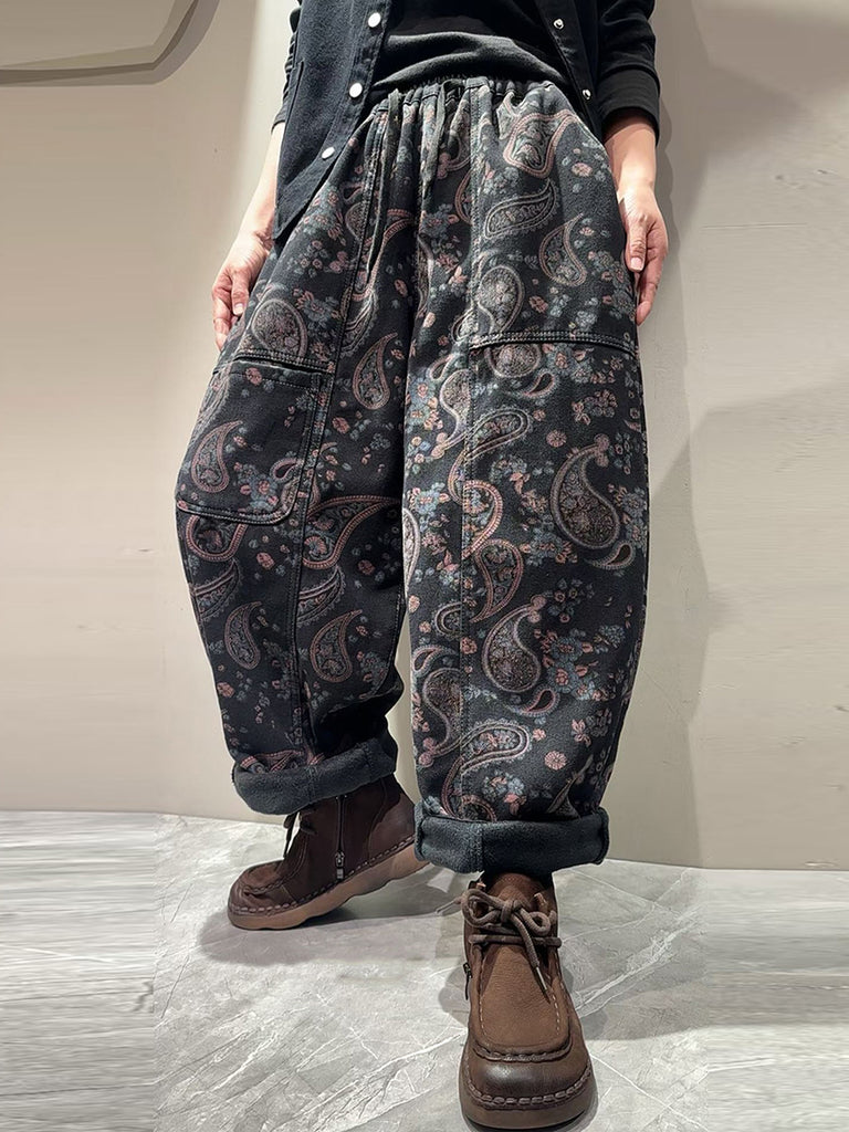 Women Winter Flower Jacquard Fleece-lined Harem Pants