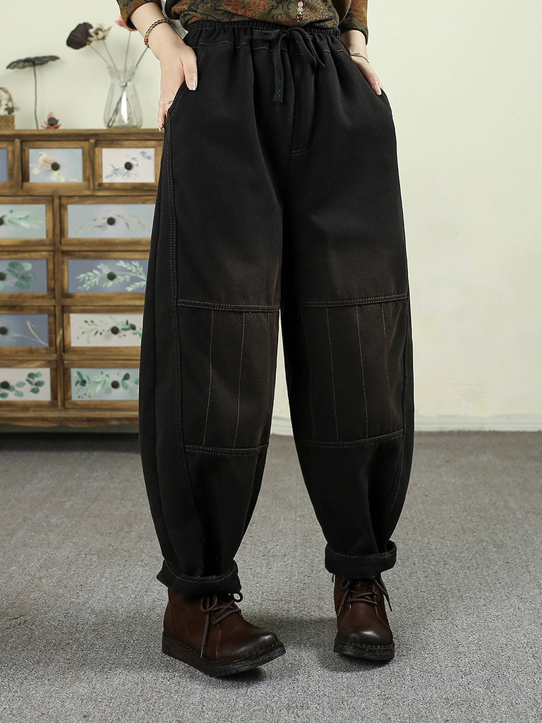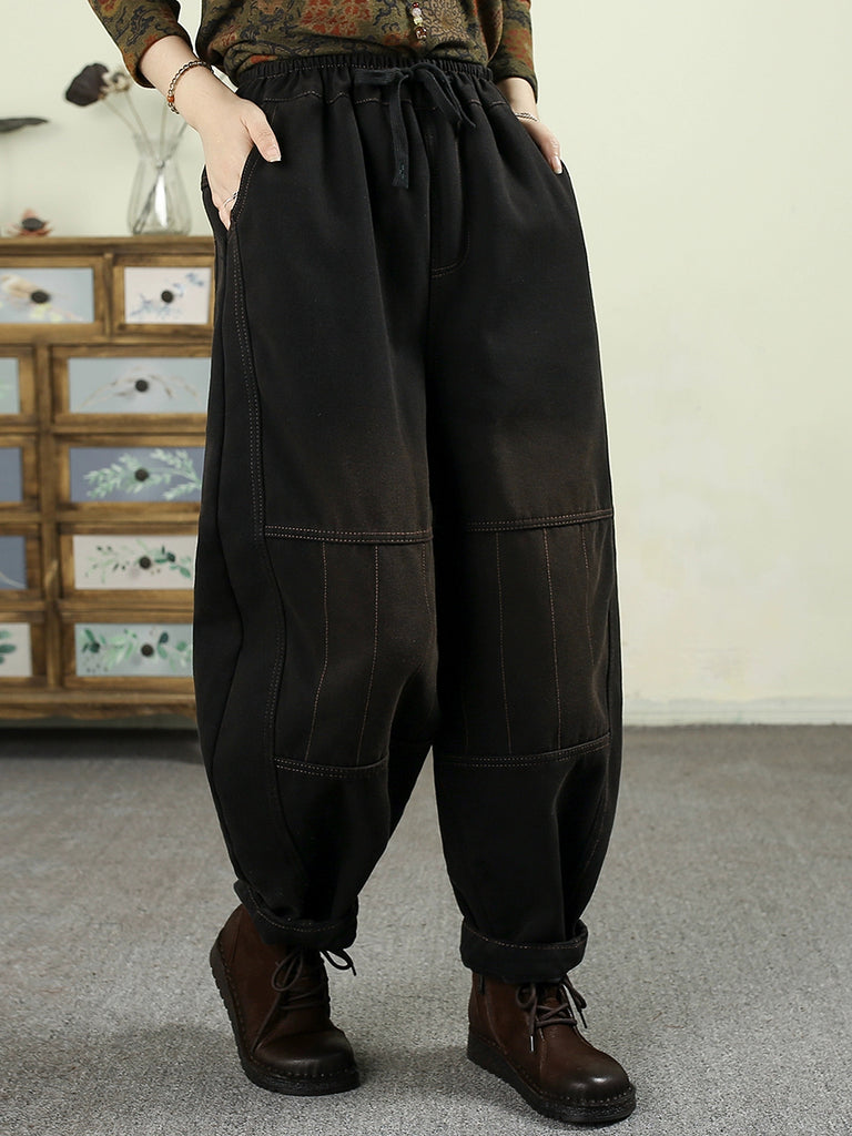 Women Vintage Pure Color Spliced Fleece-lined Harem Pants