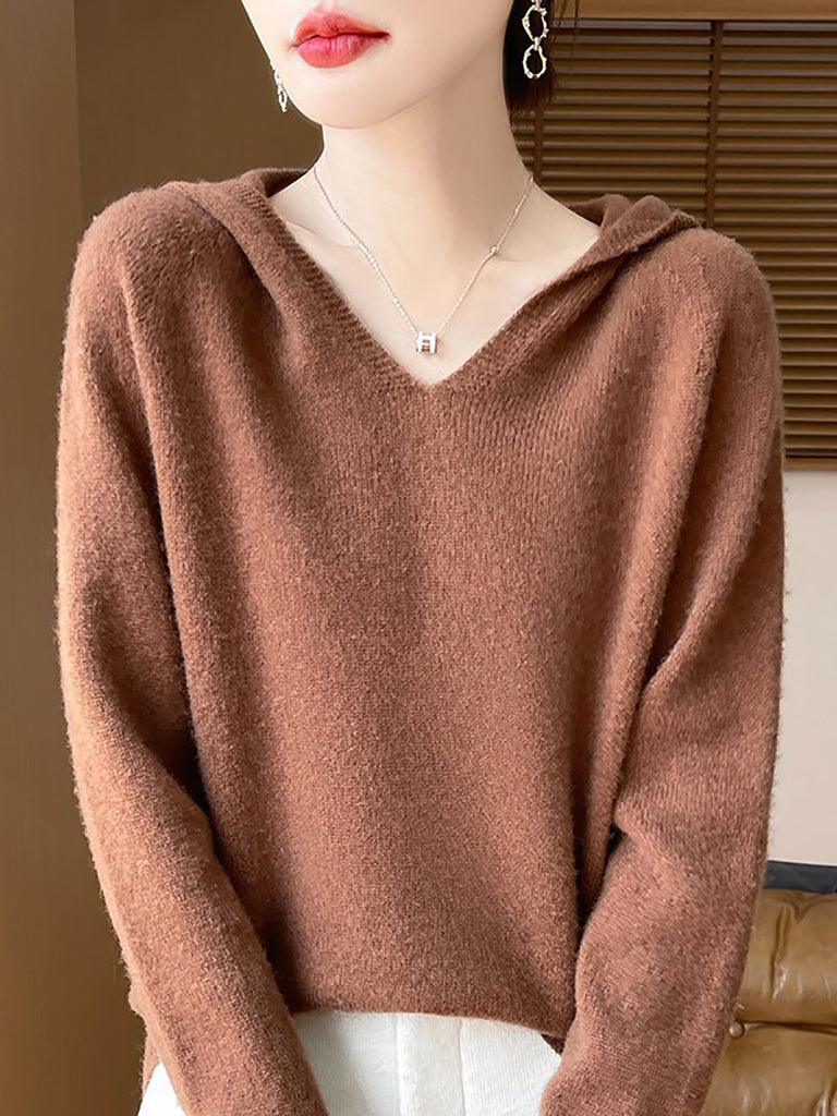 Women Autumn Artsy Pure Color Knitted V-Neck Sweater