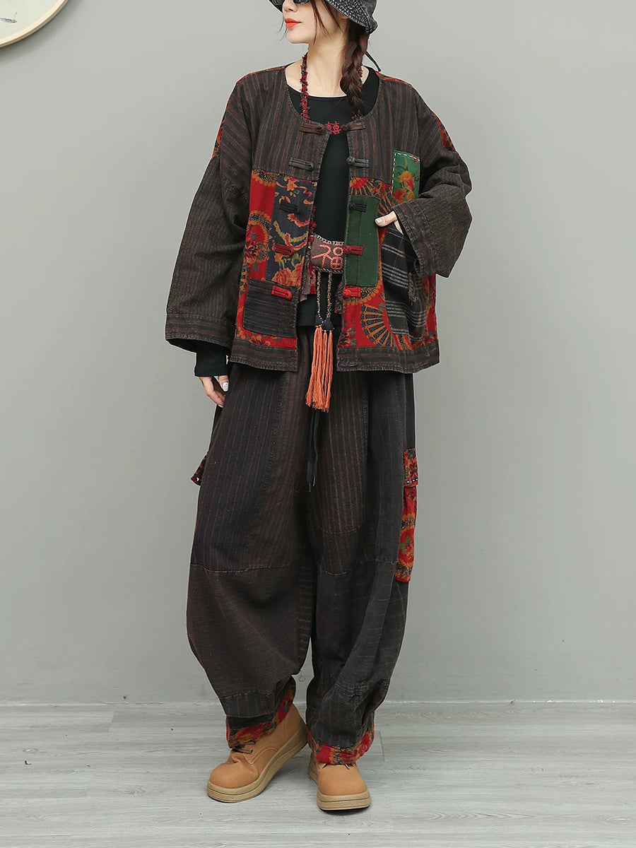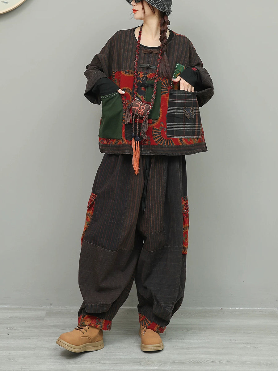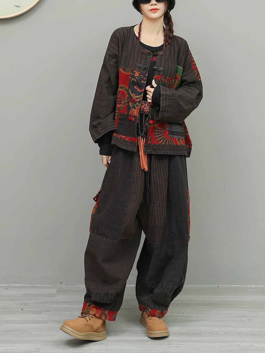 Women Spring Ethnic Stripe Spliced O-Neck Suits