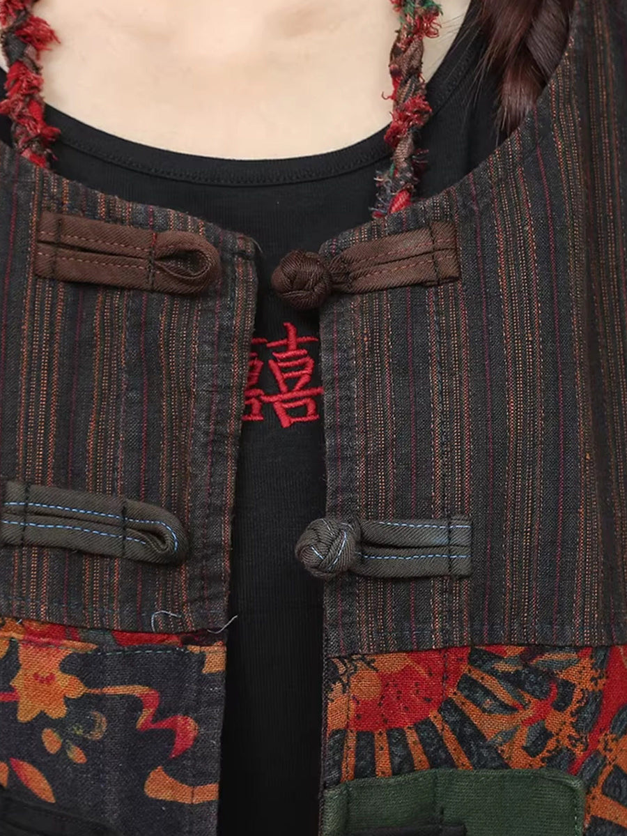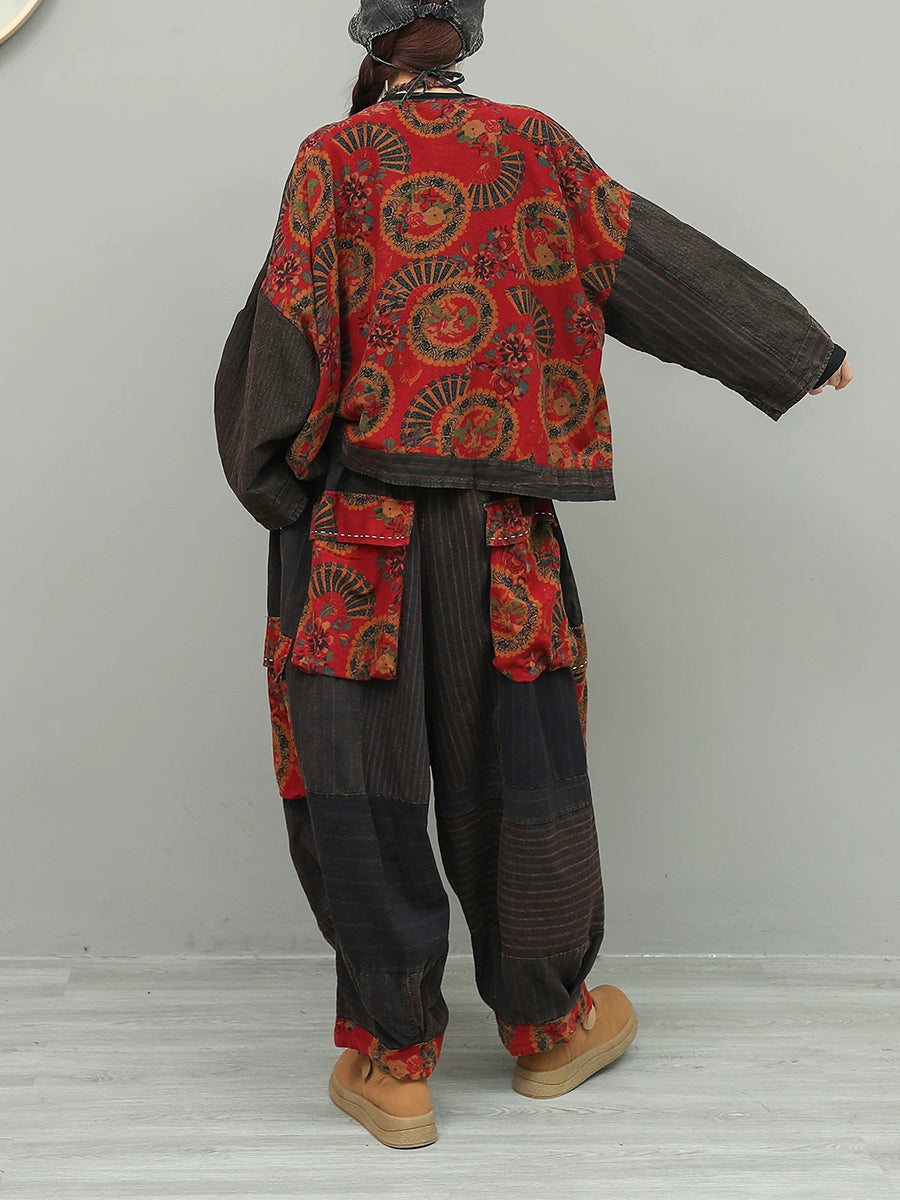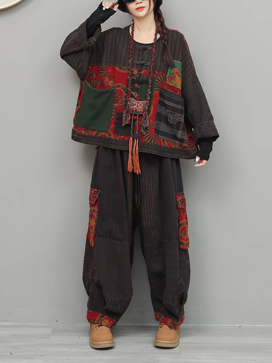 Women Spring Ethnic Stripe Spliced O-Neck Suits