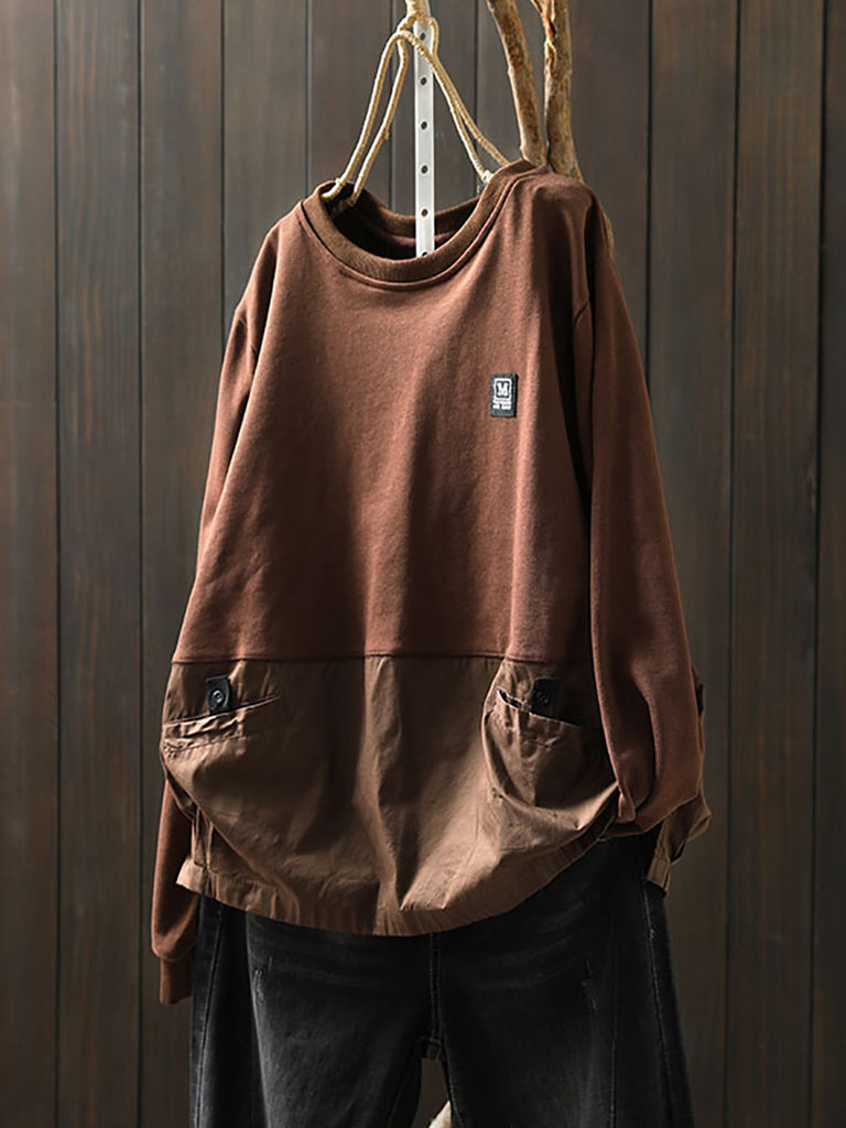 Women Autumn Pure Color Spliced O-Neck 100%Cotton Shirt