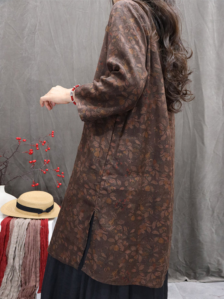 Women Autumn Retro Flower 100%Linen V-Neck Shirt