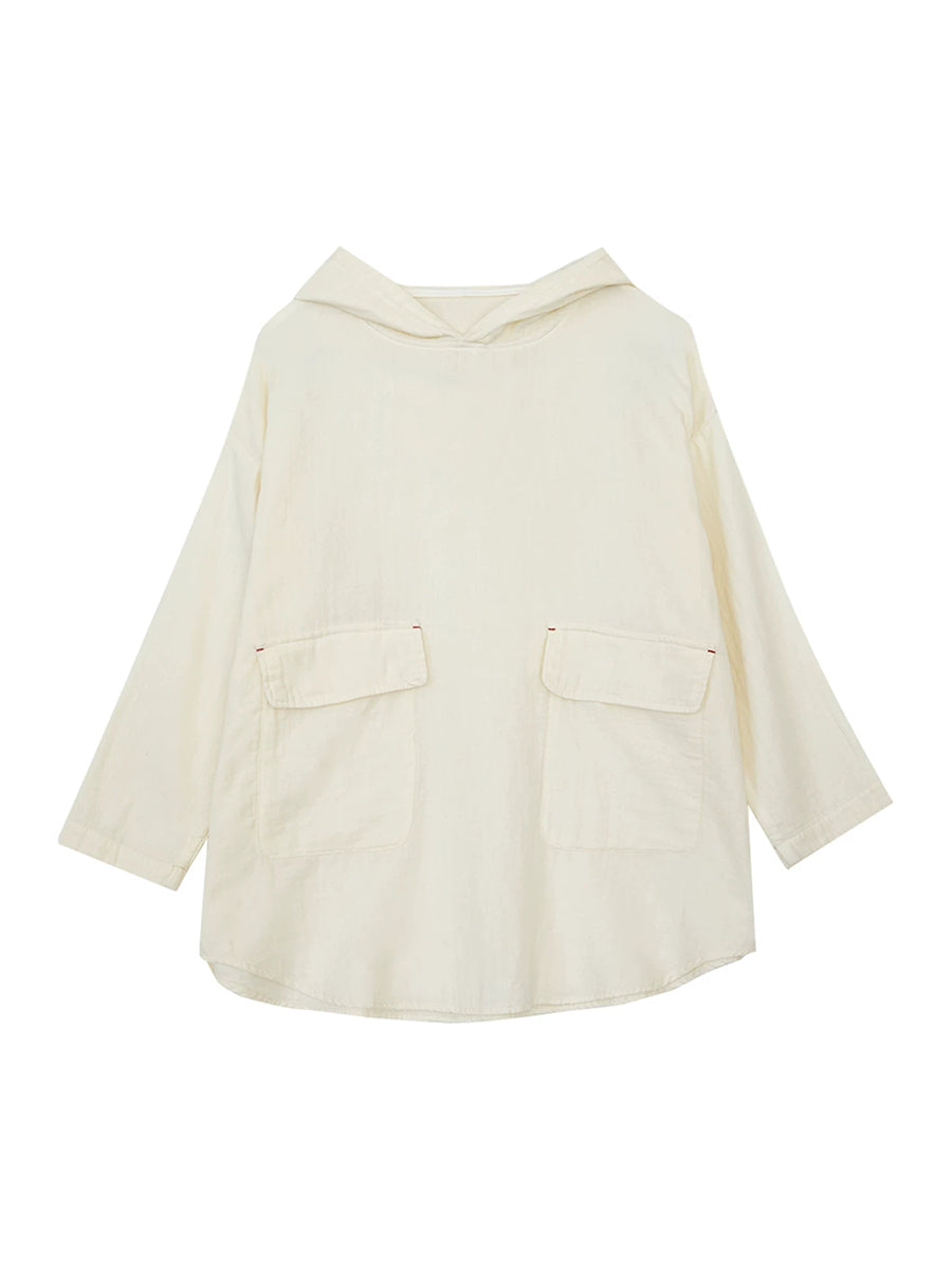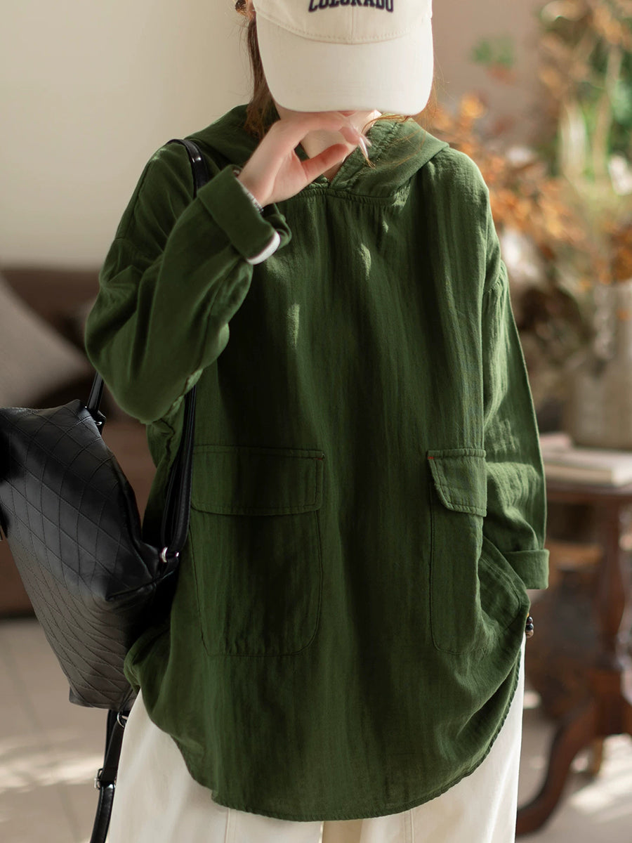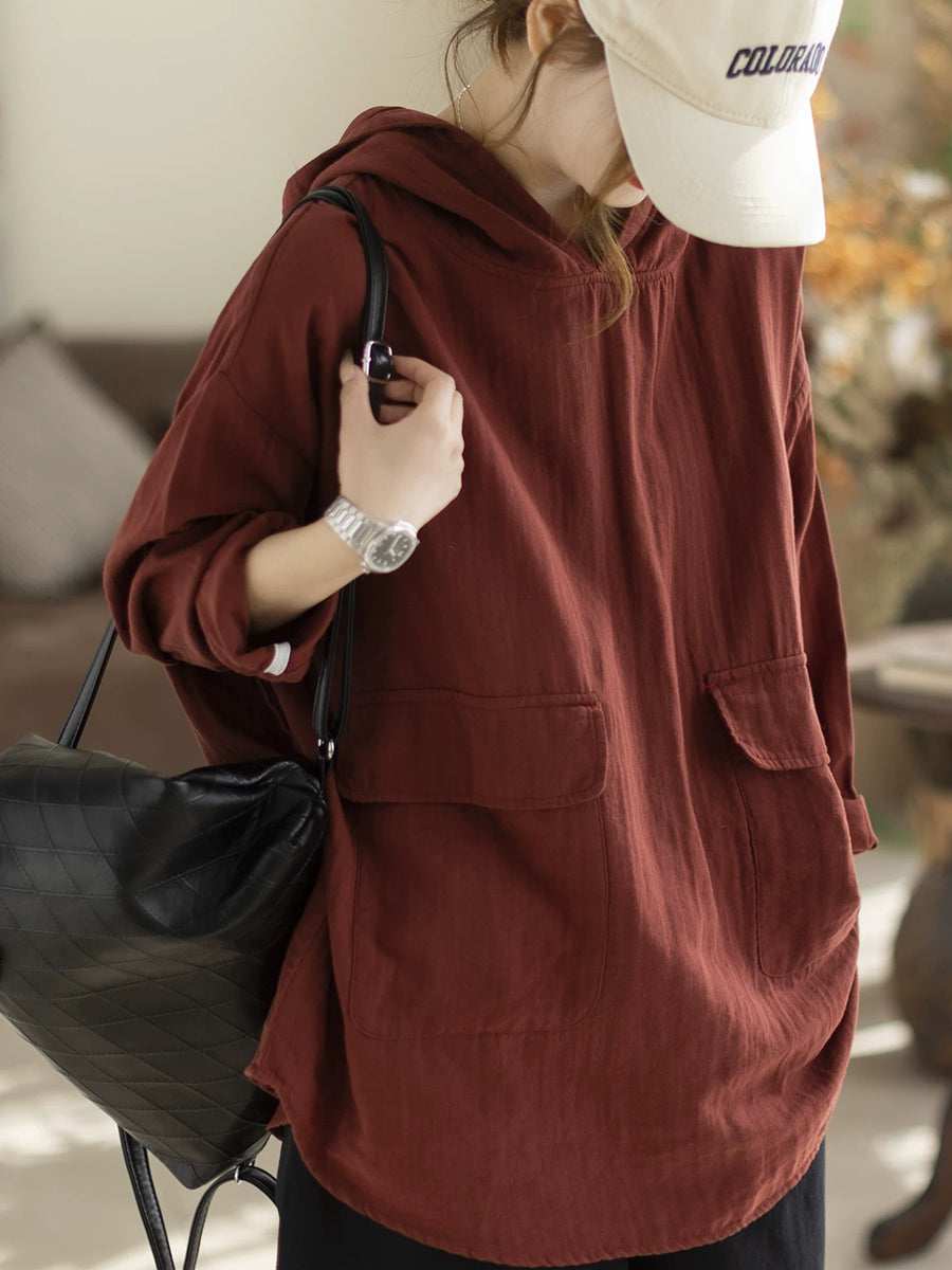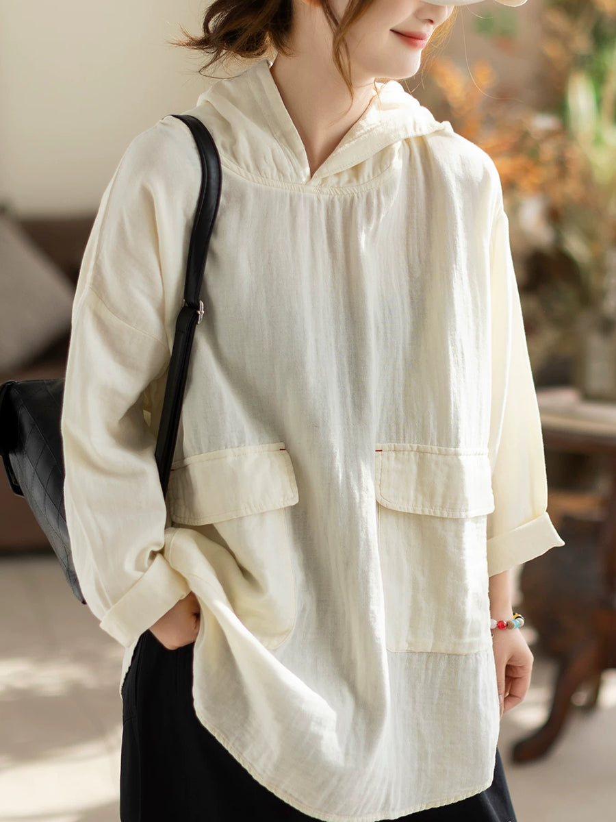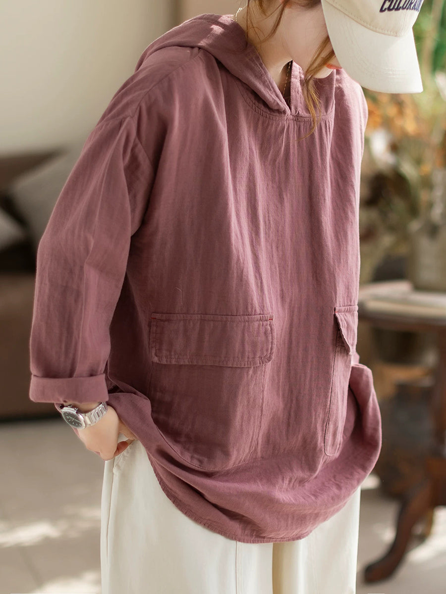 Women Spring Casual Pure Color Hooded Blouse
