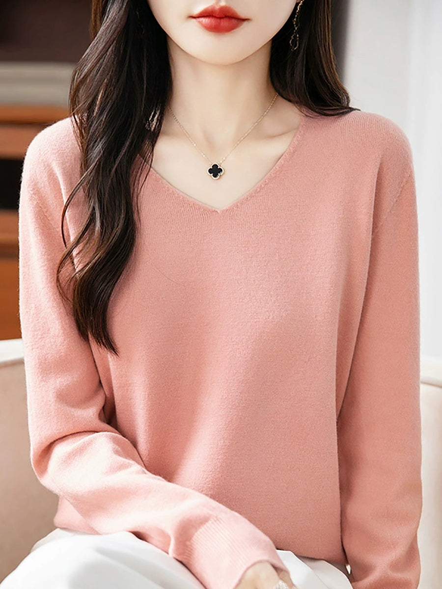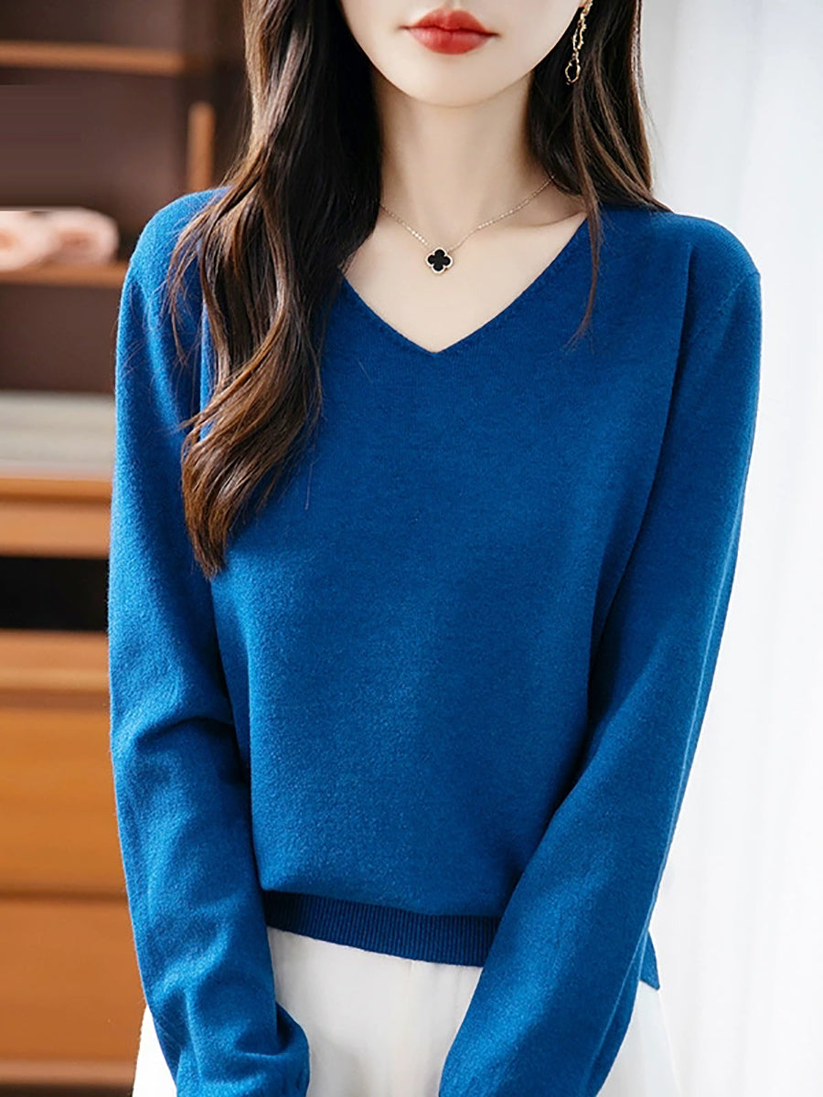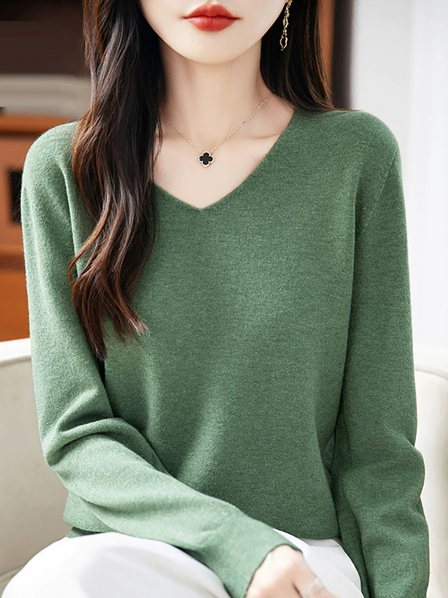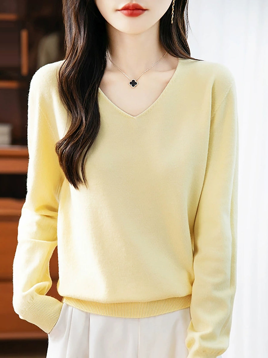 Women Spring Casual Pure Color V-Neck Sweater