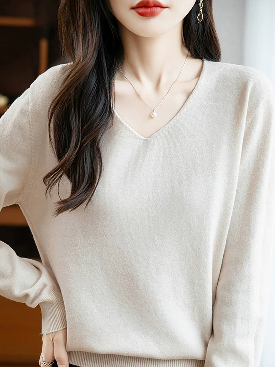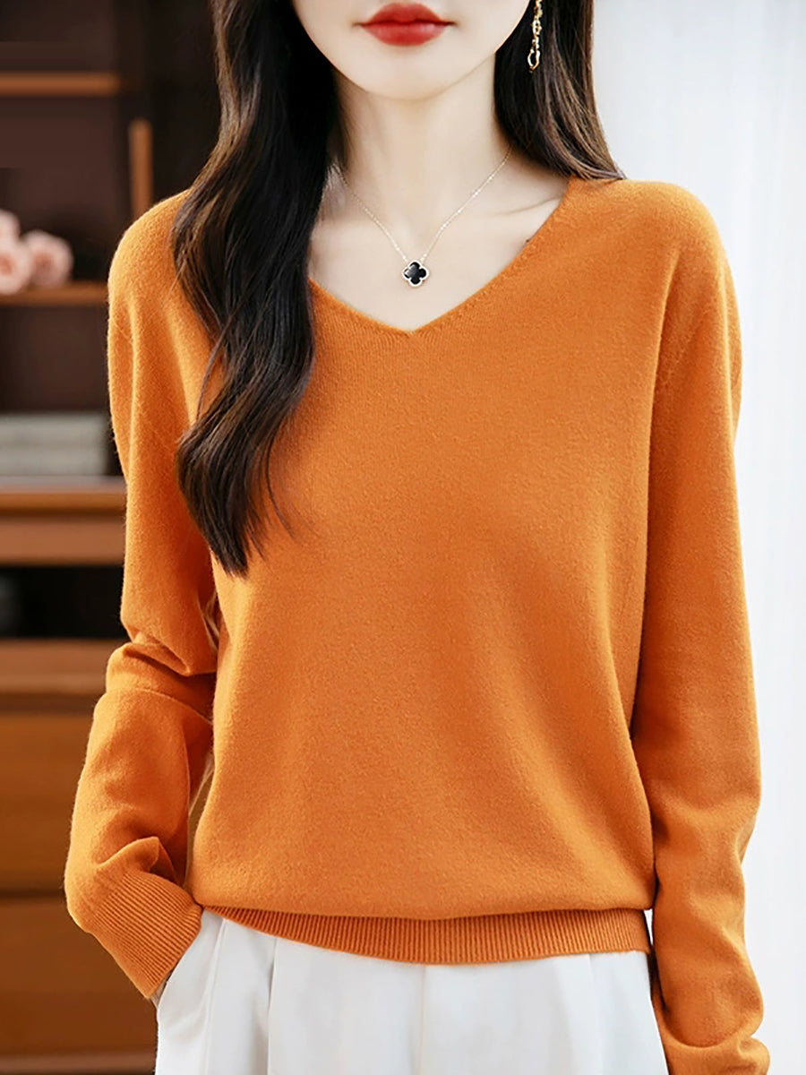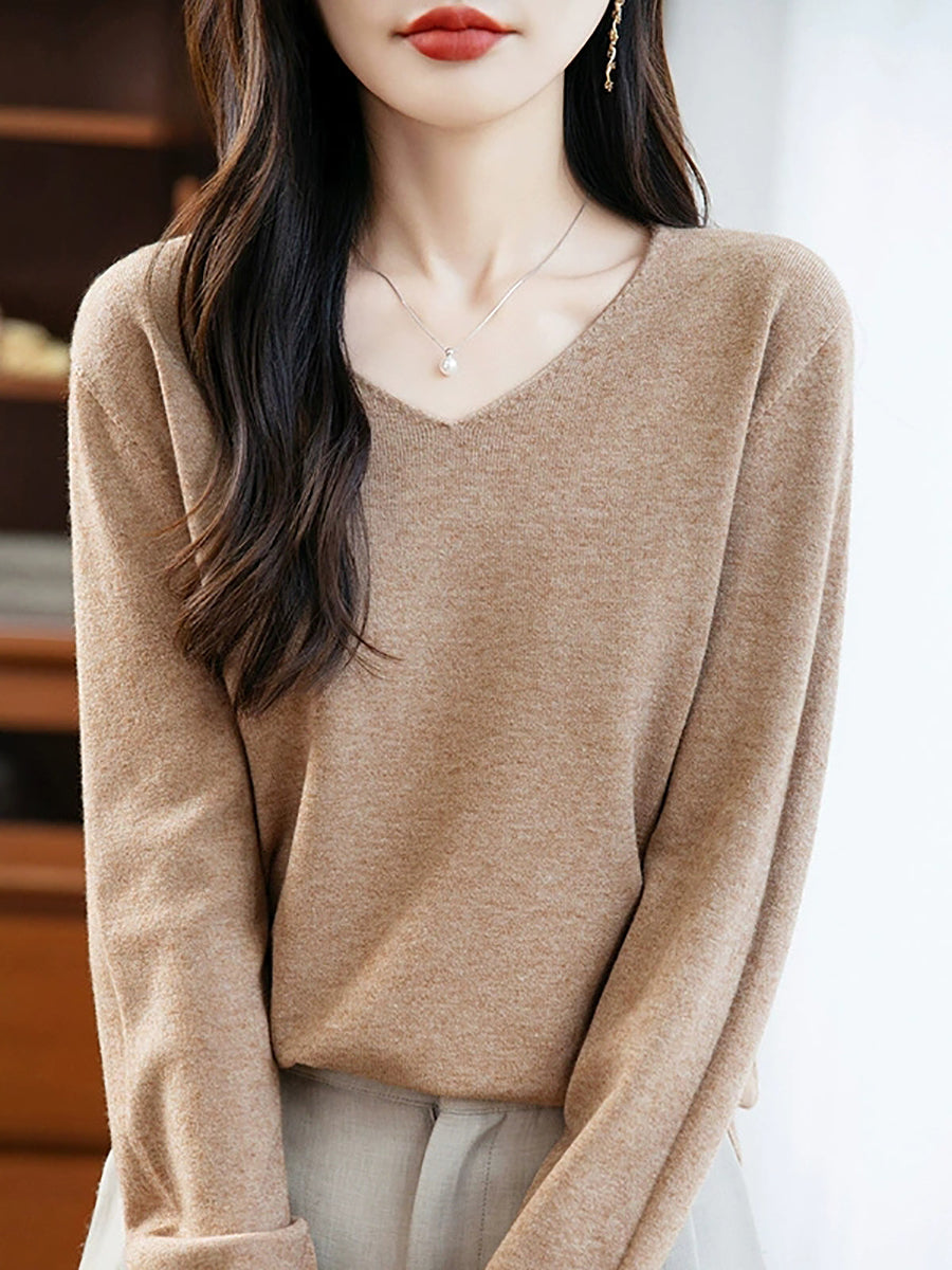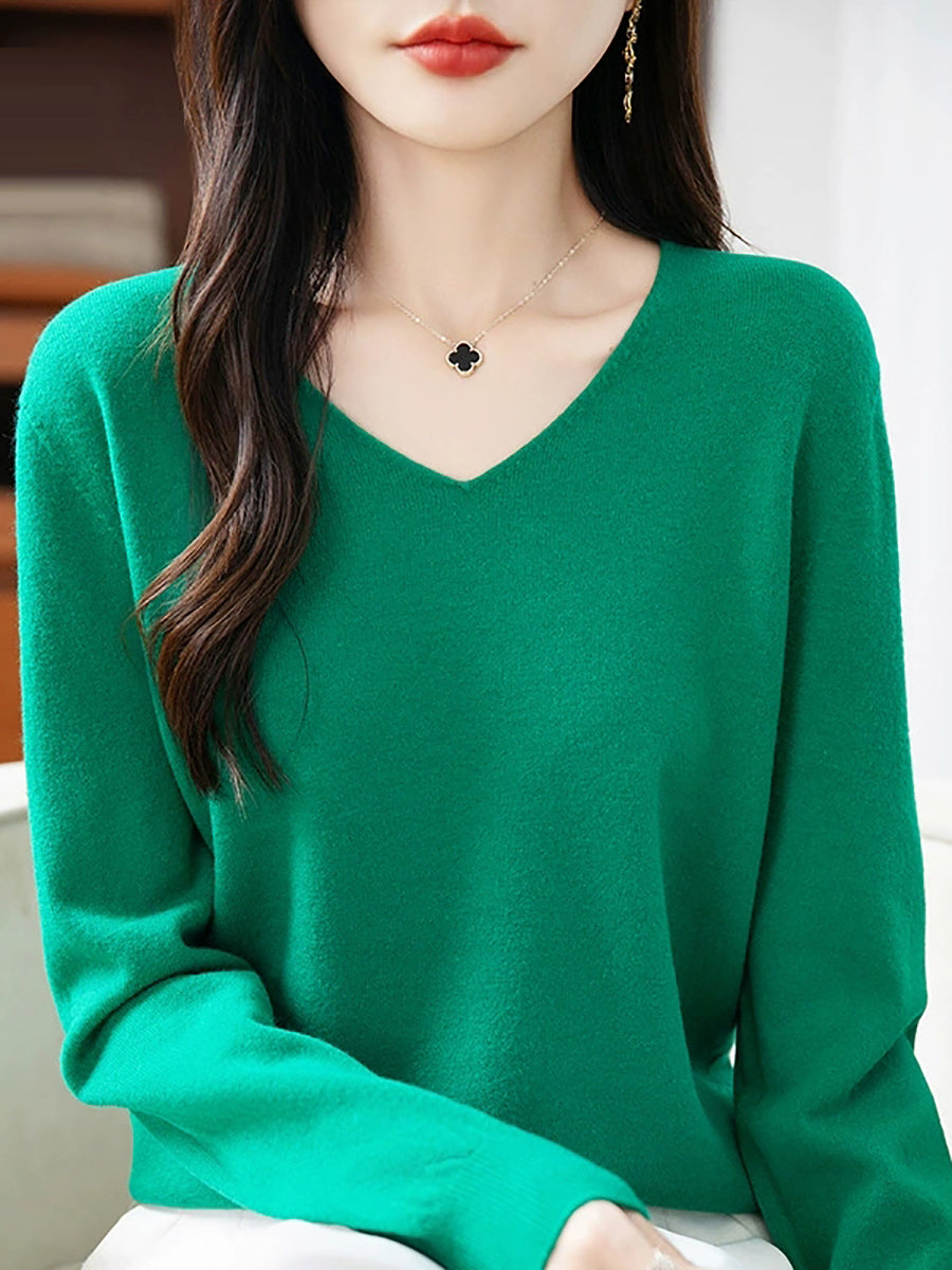 Women Spring Casual Pure Color V-Neck Sweater