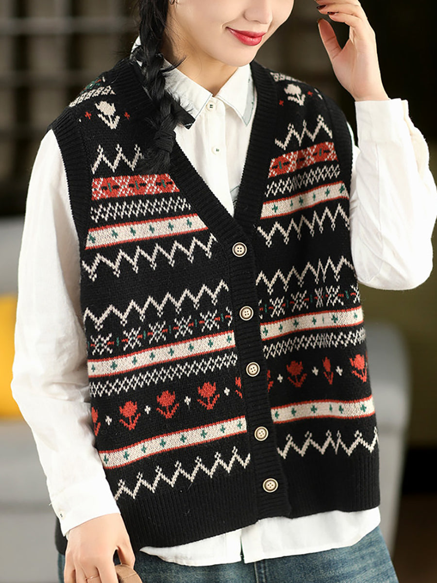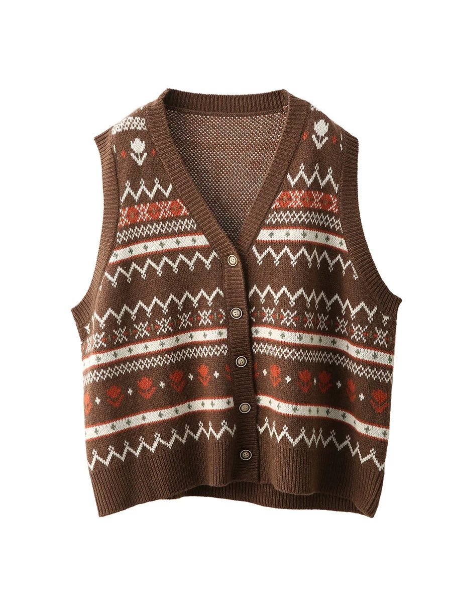 Women Spring Retro Jacquard V-Neck Vest