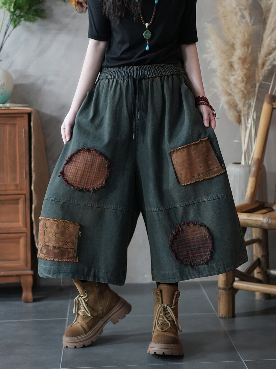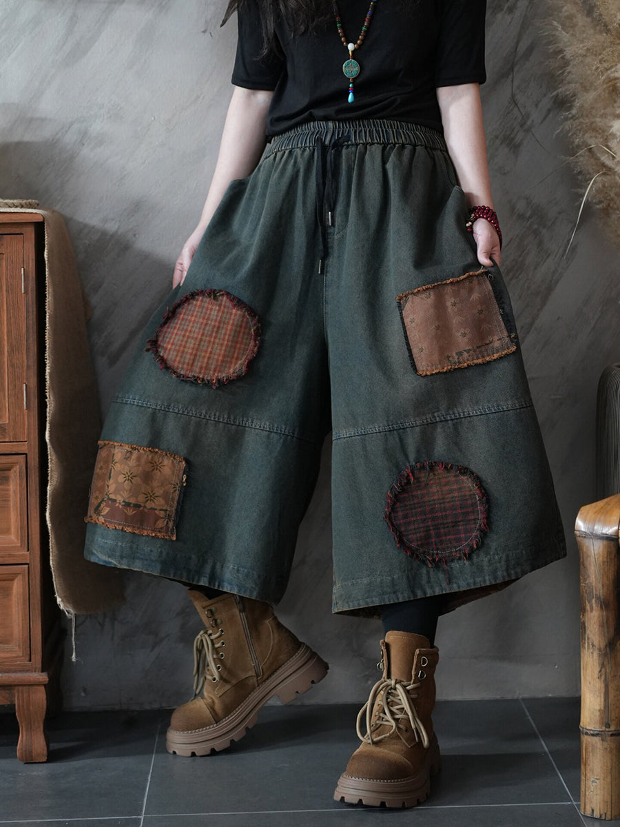 Women Summer Vintage Denim Spliced Wide-leg Pants