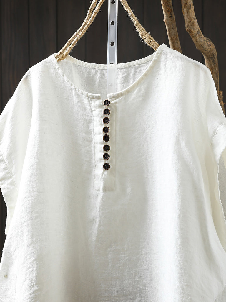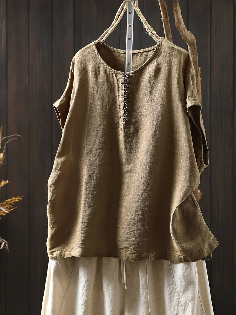 Plus Size Women Summer Casual Pure Color O-Neck 100%Linen Shirt