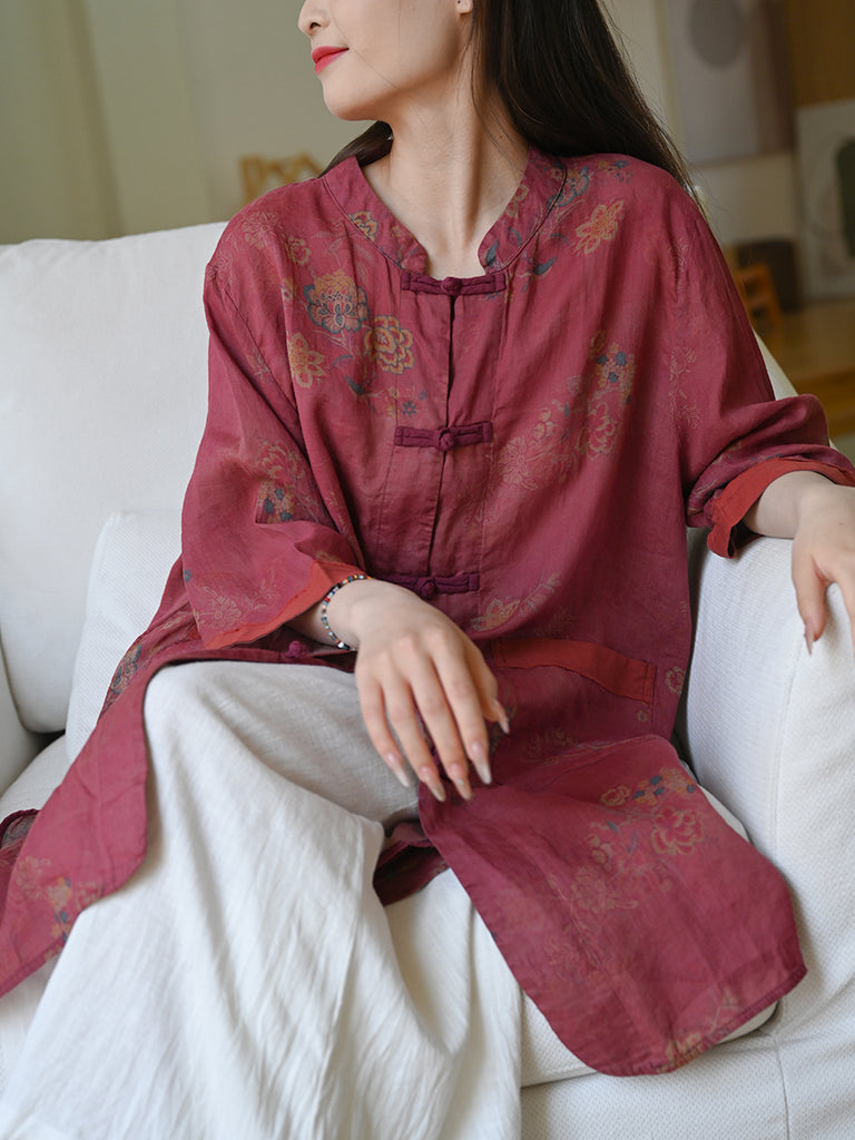 Women Summer Ethnic Flower 100%Ramie Stand Collar Shirt