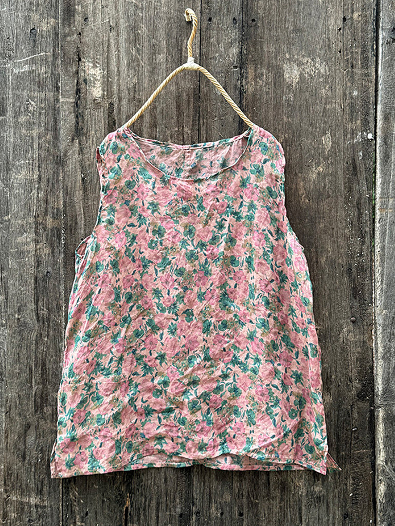 Women Summer Vintage Floral O-Neck Ramie Vest