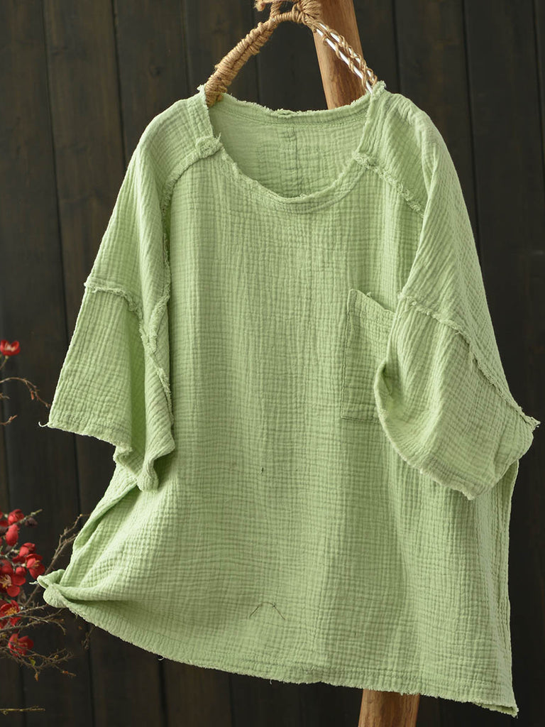 Women Summer Worn Pure Color O-Neck Cotton Shirt