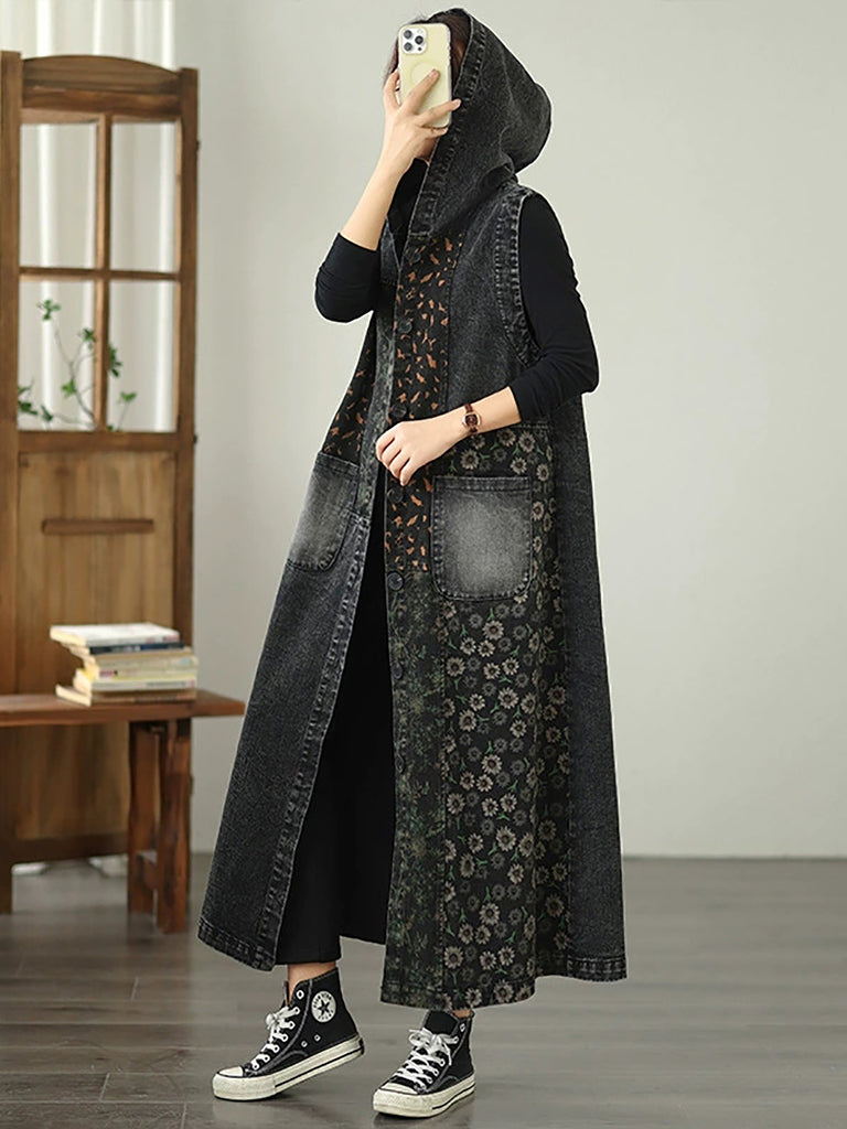 Women Vintage Denim Flower Spliced Hooded Vest Coat