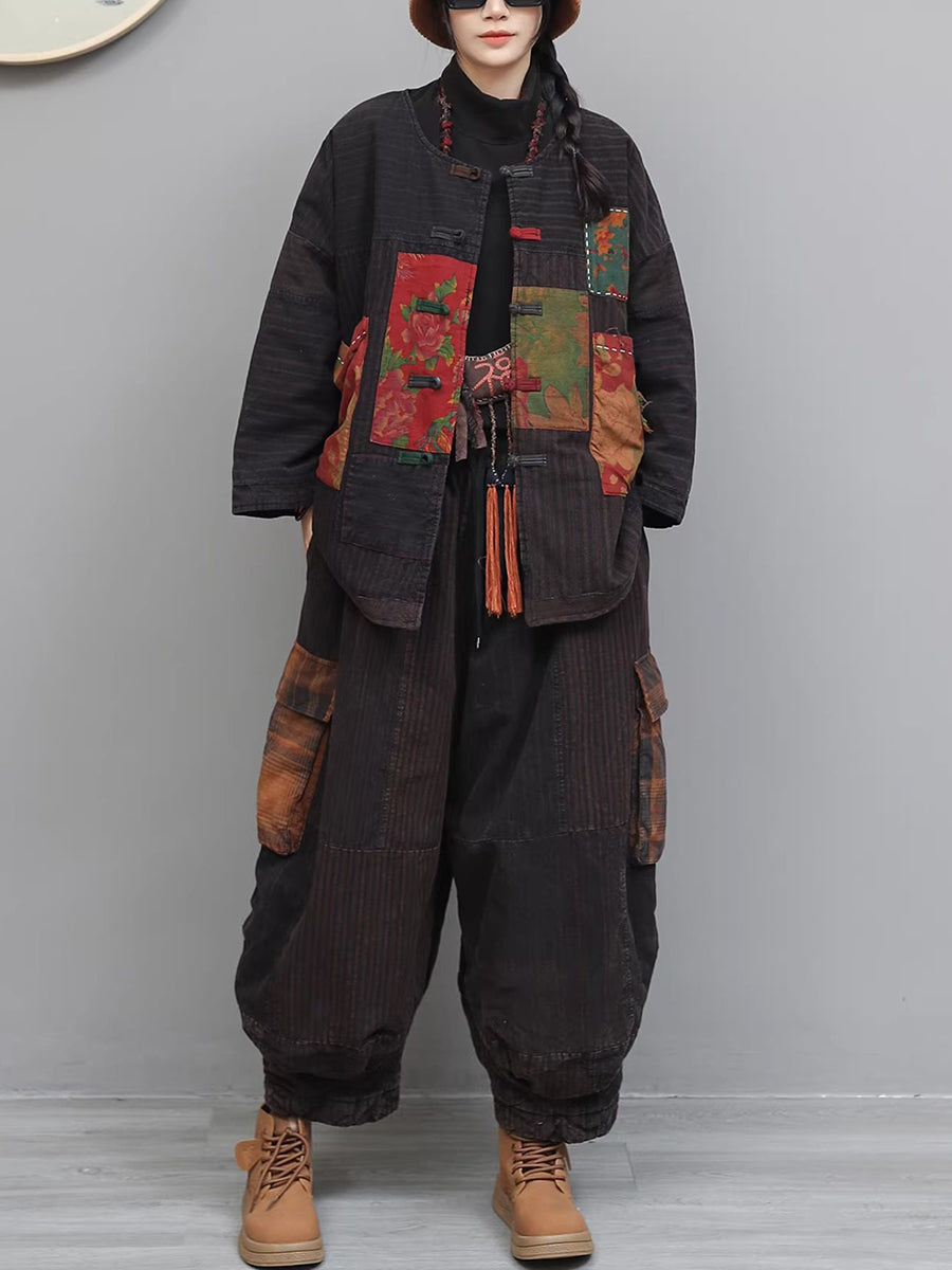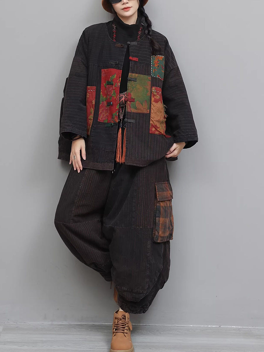 Women Winter Ethnic Patch Spliced O-Neck Suits