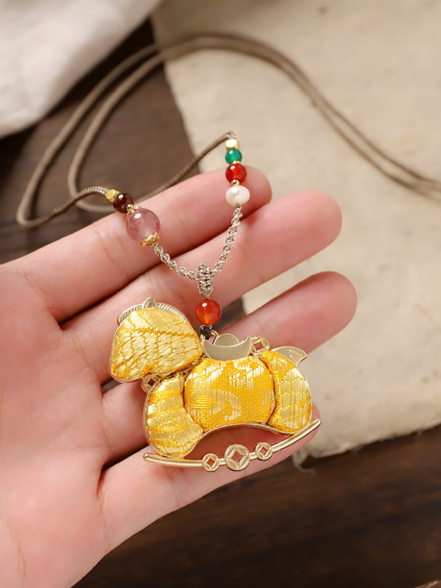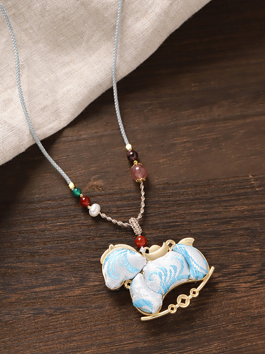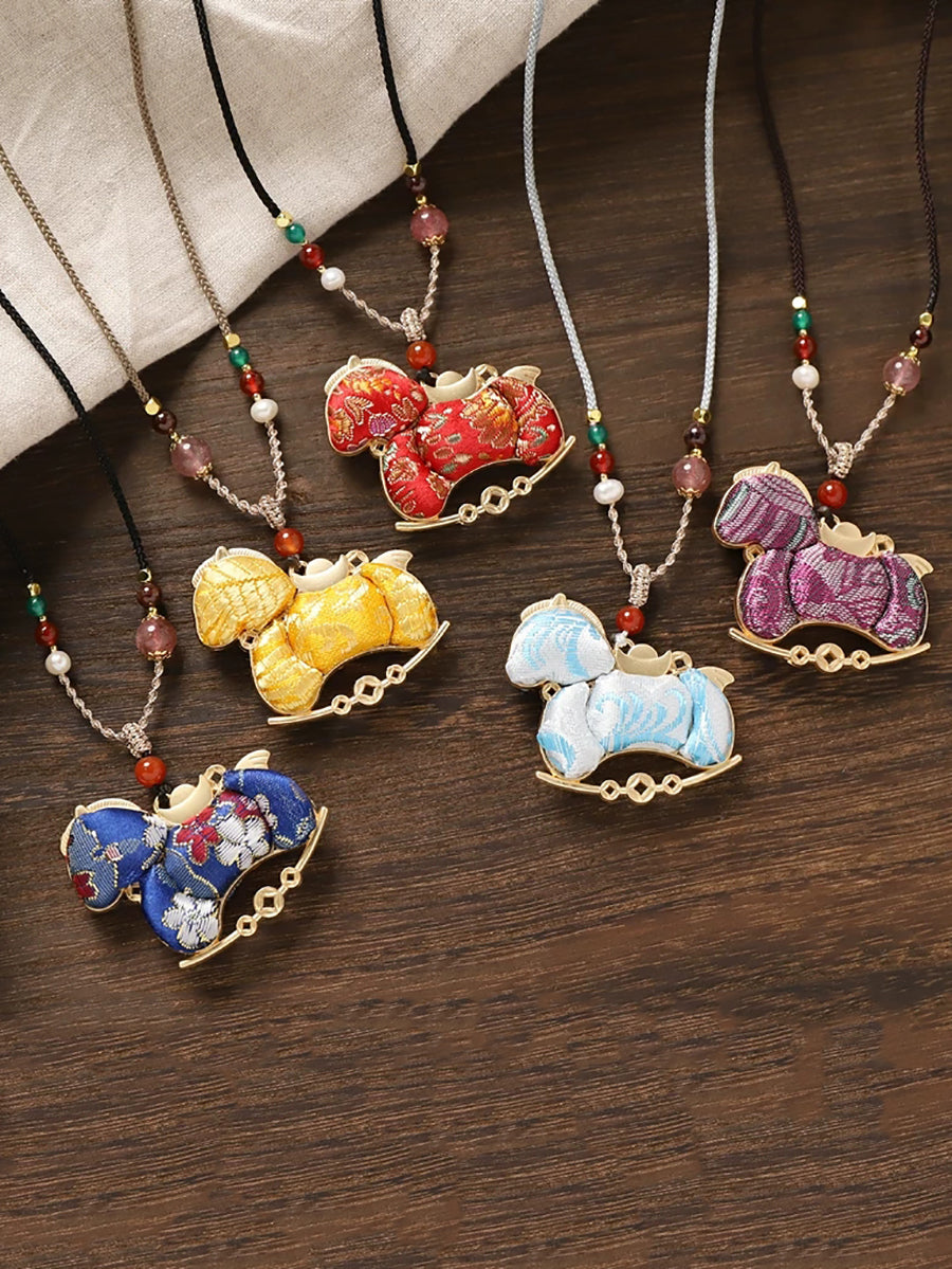 Lange Halskette mit doppelseitigem Brokat-Pferdeanhänger im Ethno-Stil