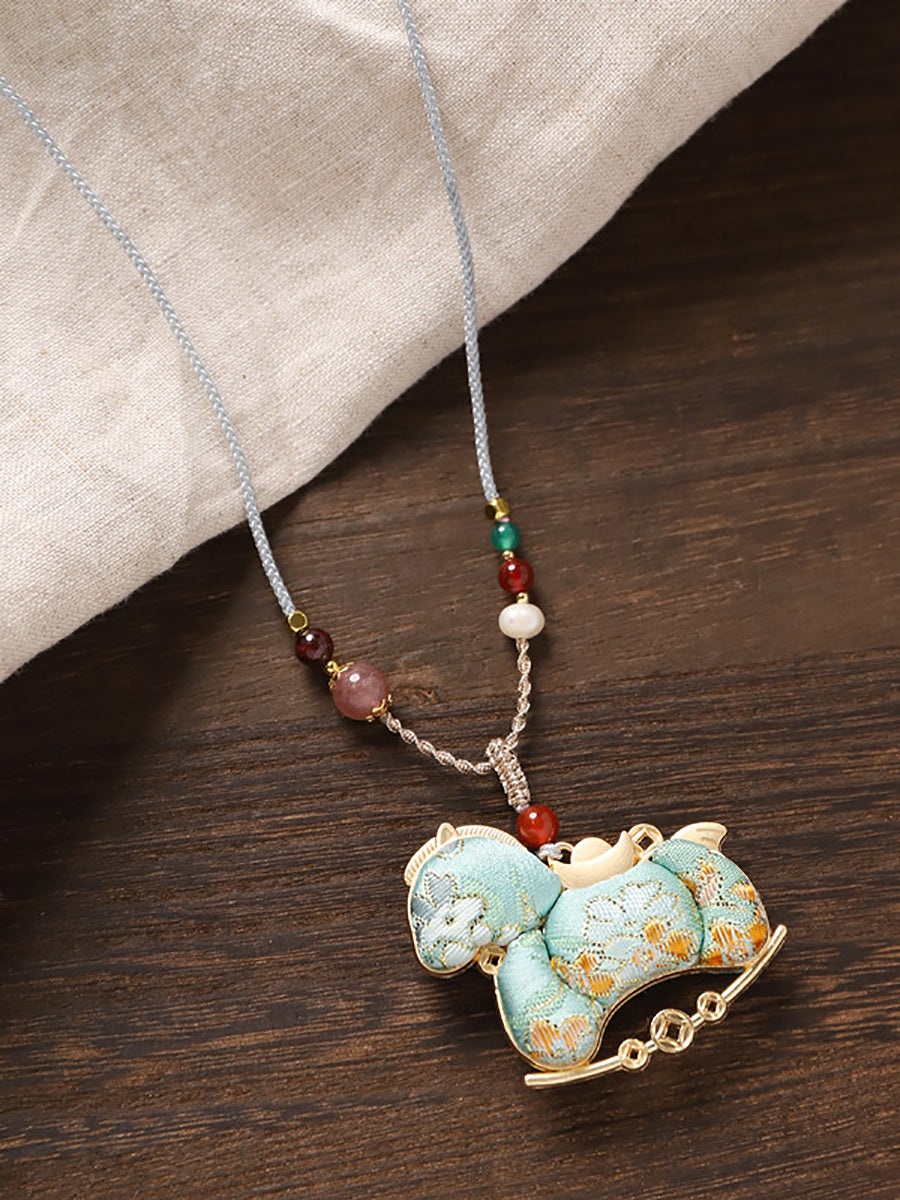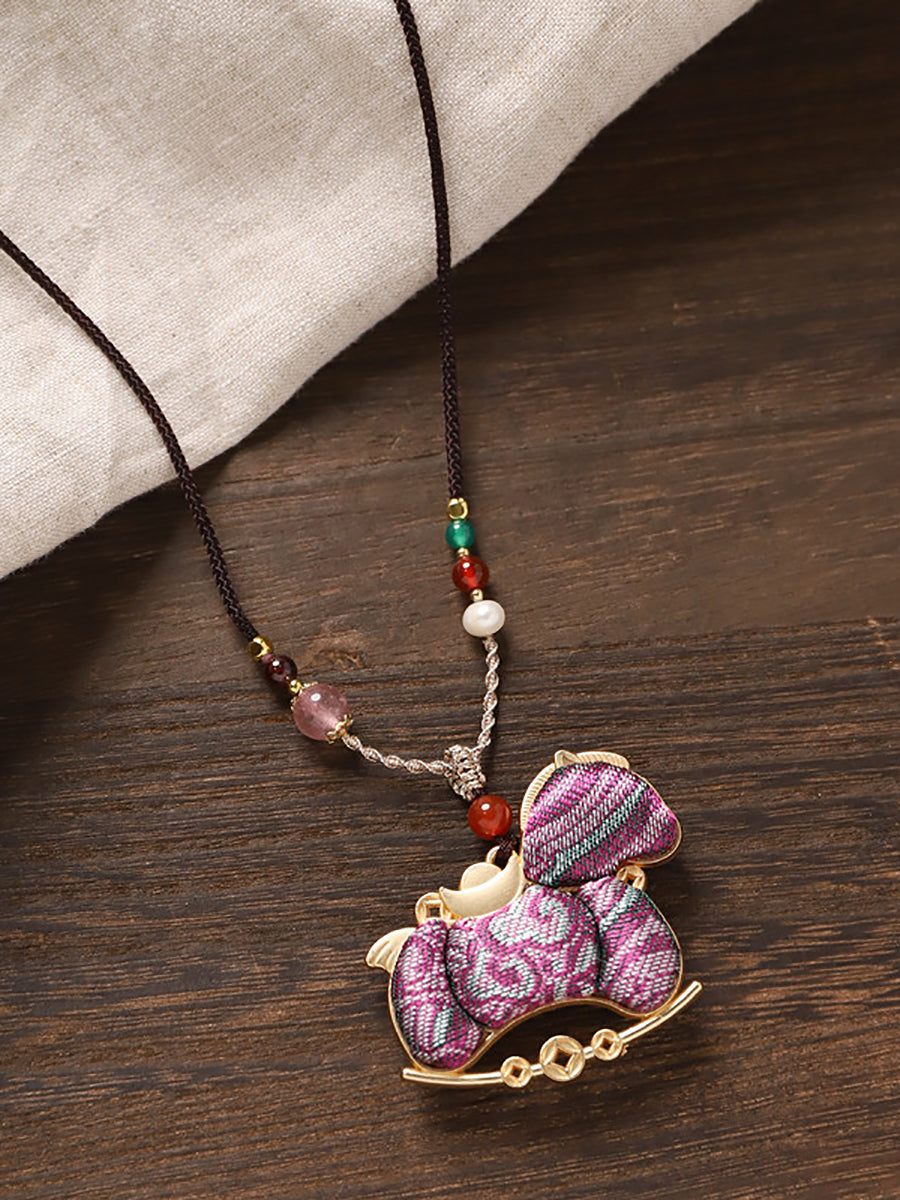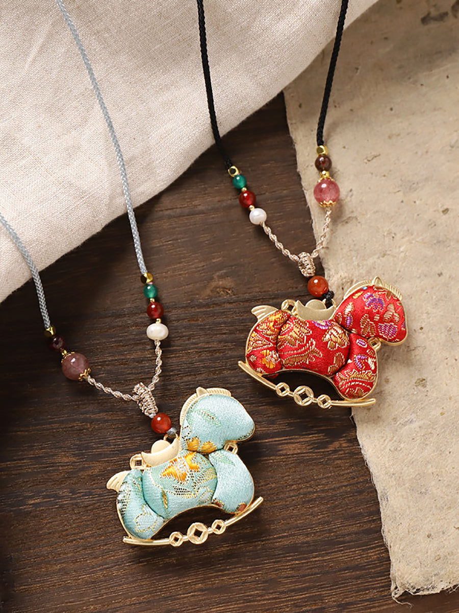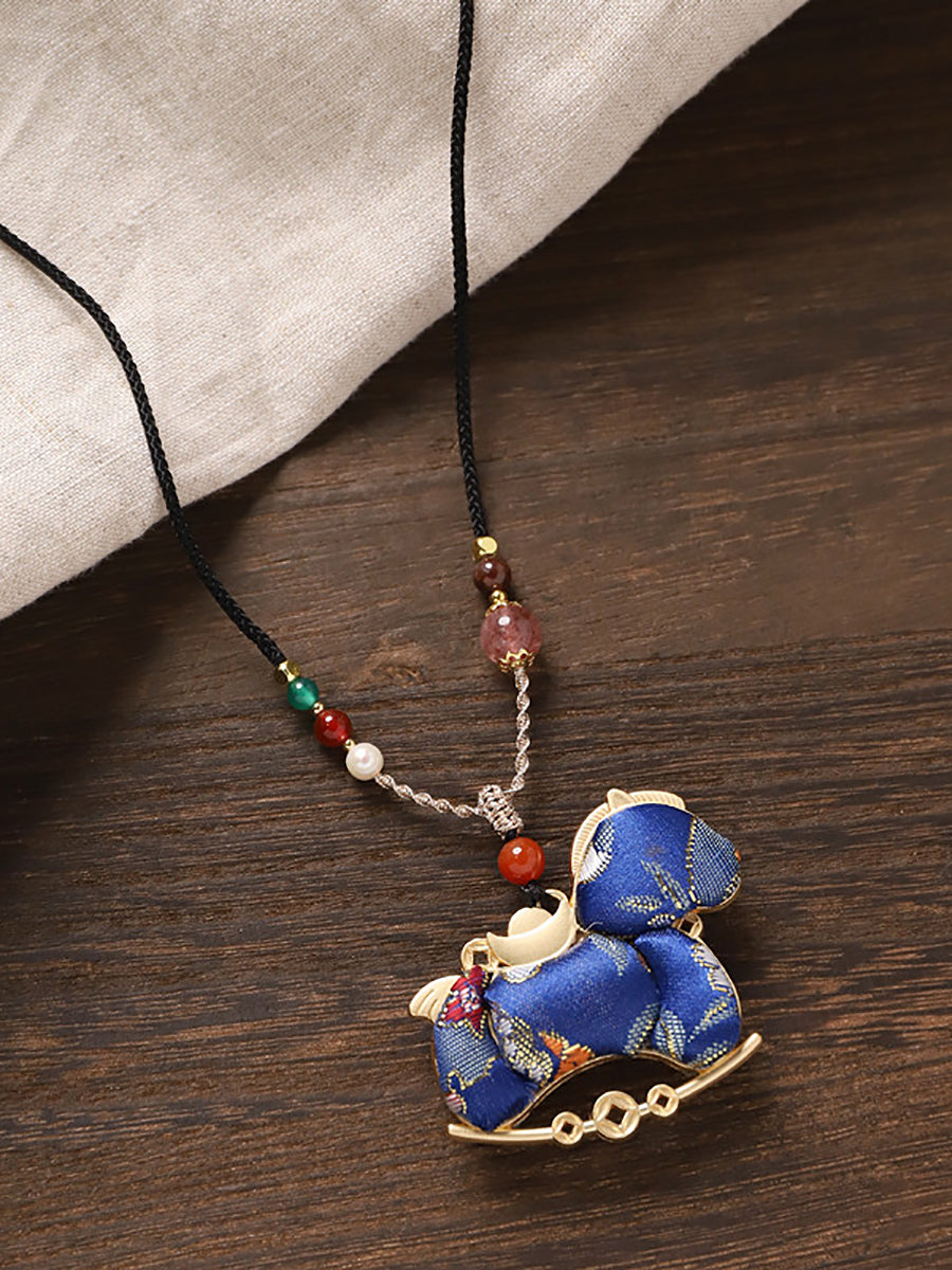 Lange Halskette mit doppelseitigem Brokat-Pferdeanhänger im Ethno-Stil