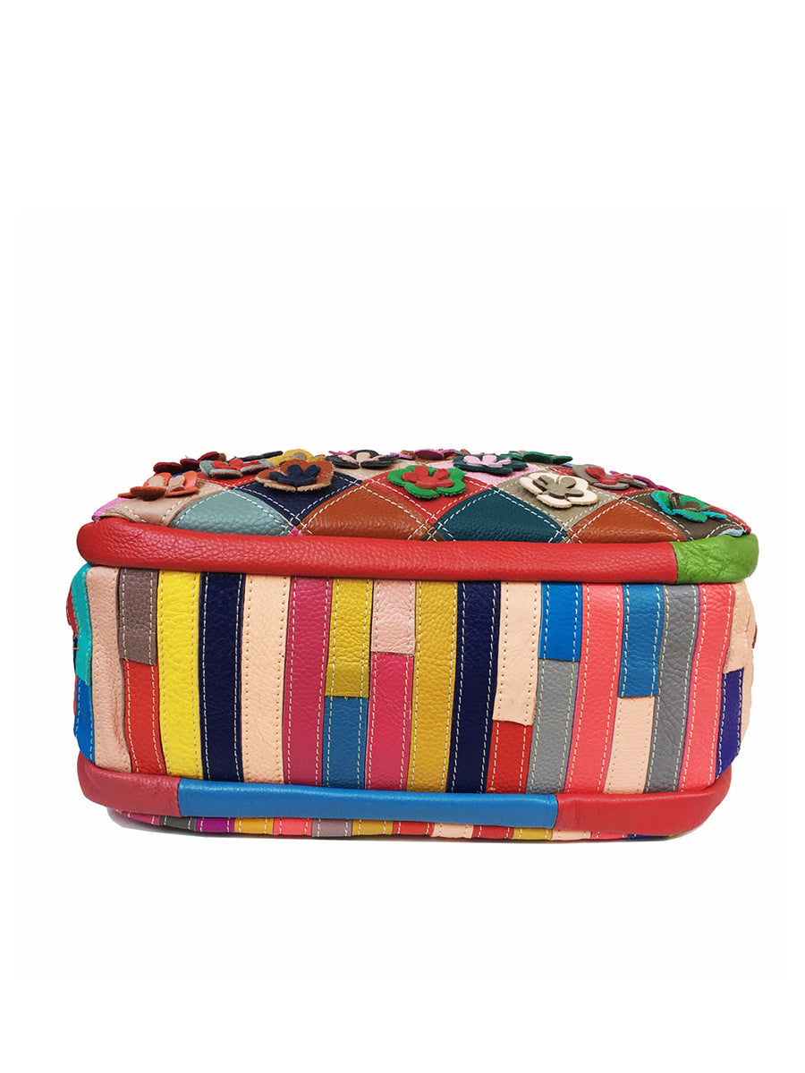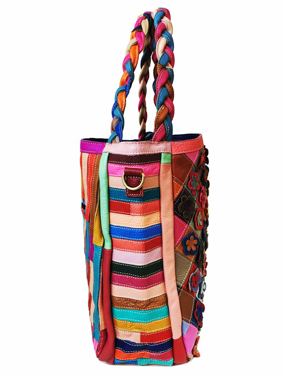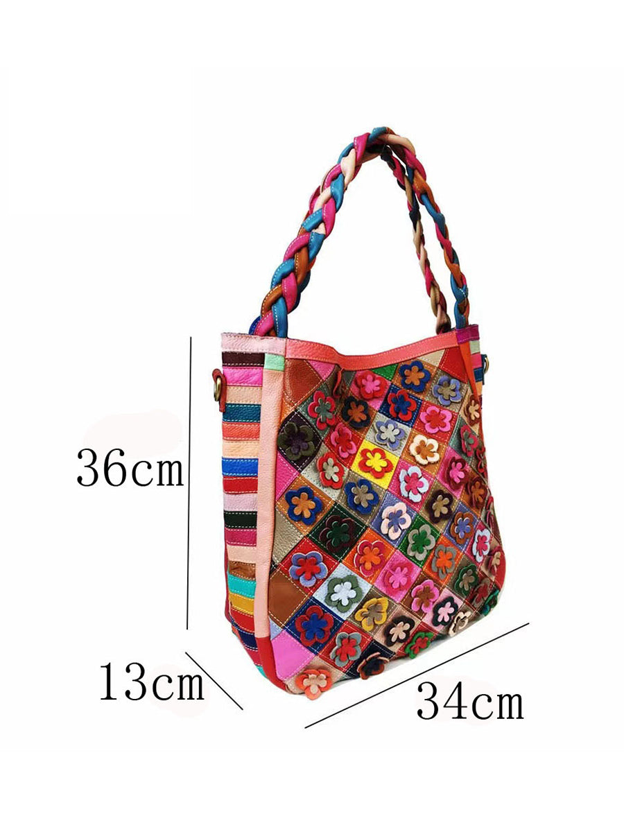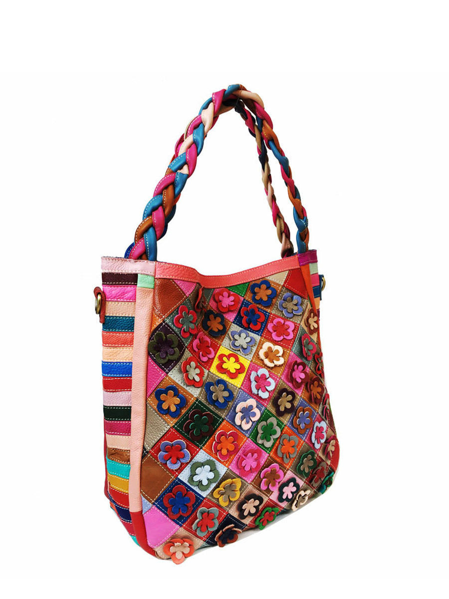 Vintage-Umhängetasche aus Leder mit Blumenmuster und mehrfarbigem Strickriemen