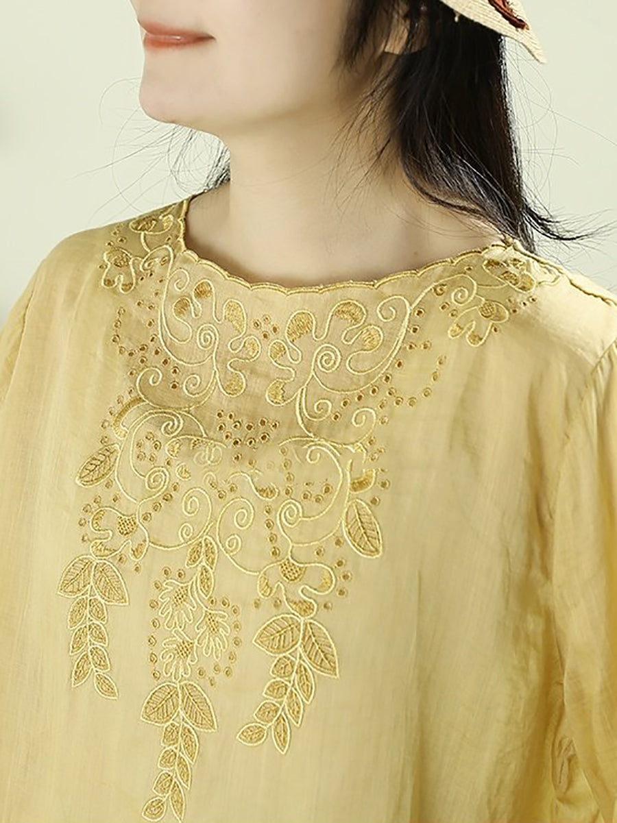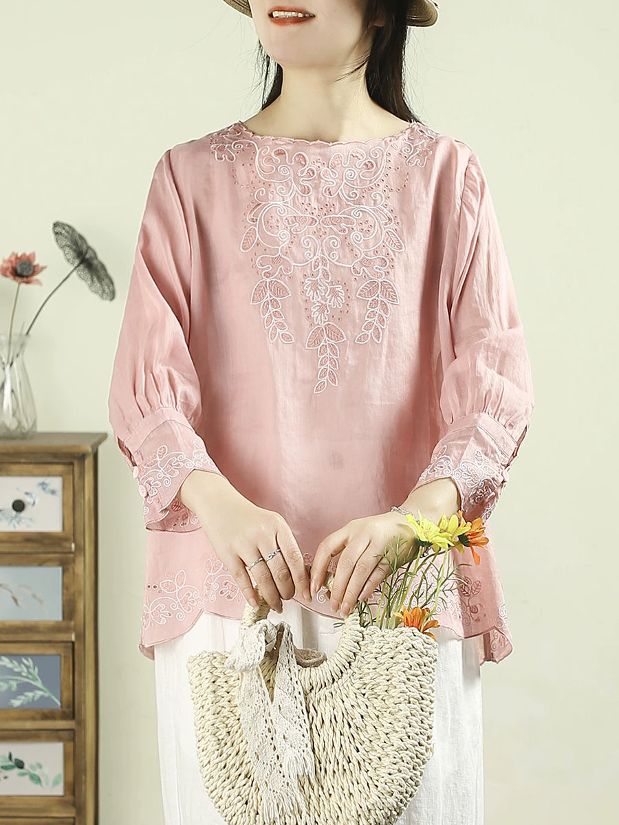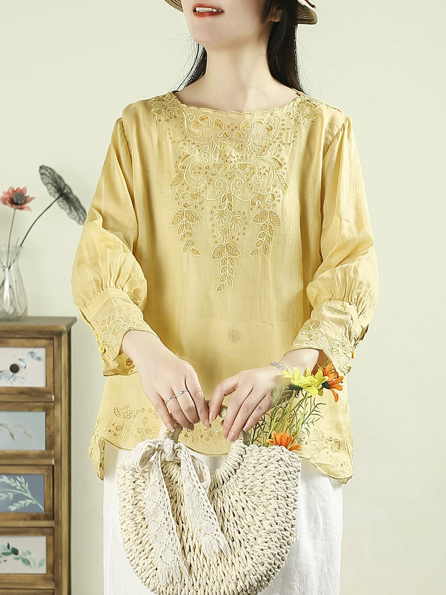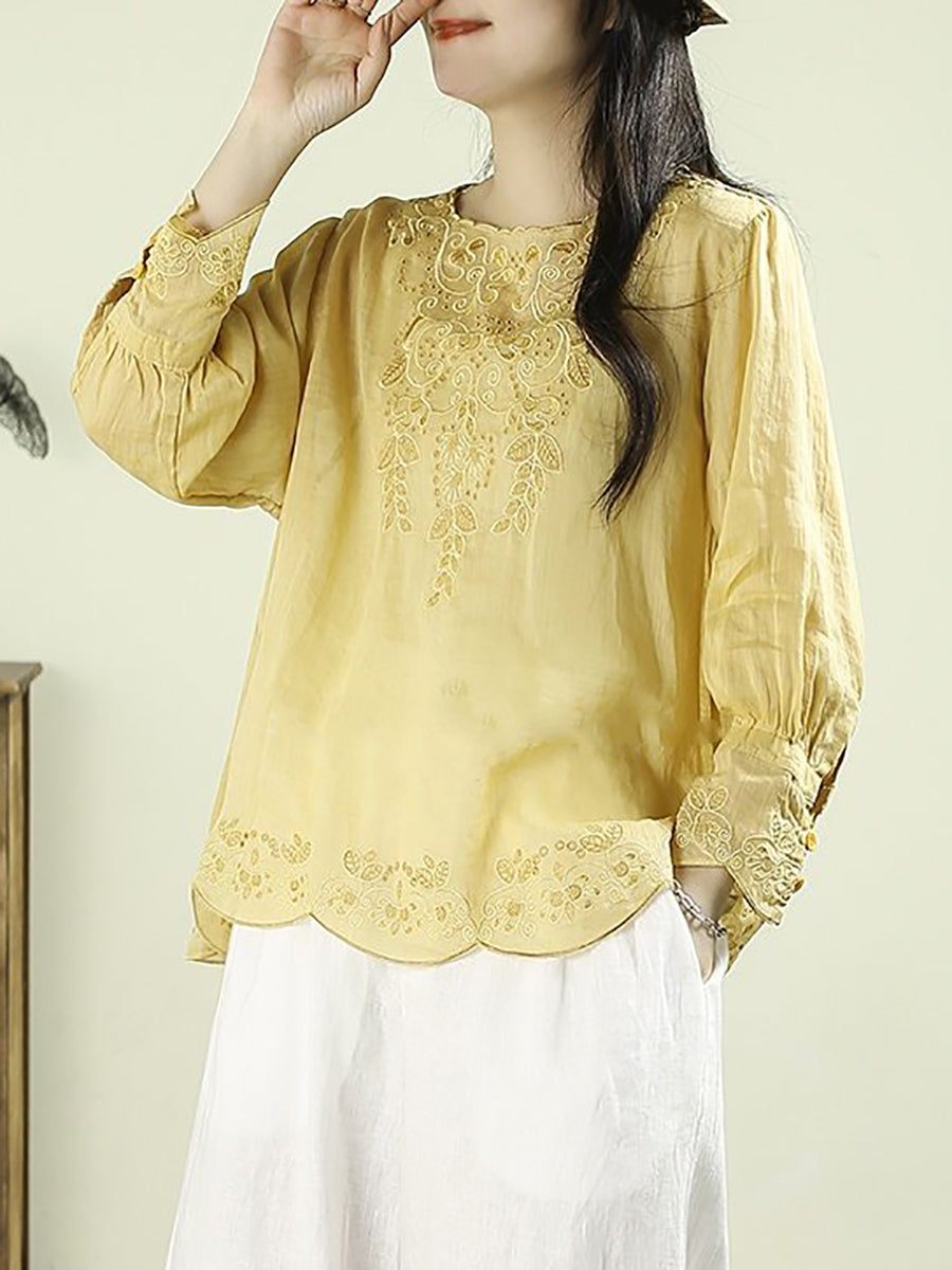 Damenbluse mit kunstvoller Frühlingsstickerei, Rundhalsausschnitt, 100 % Ramie
