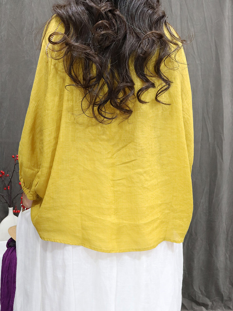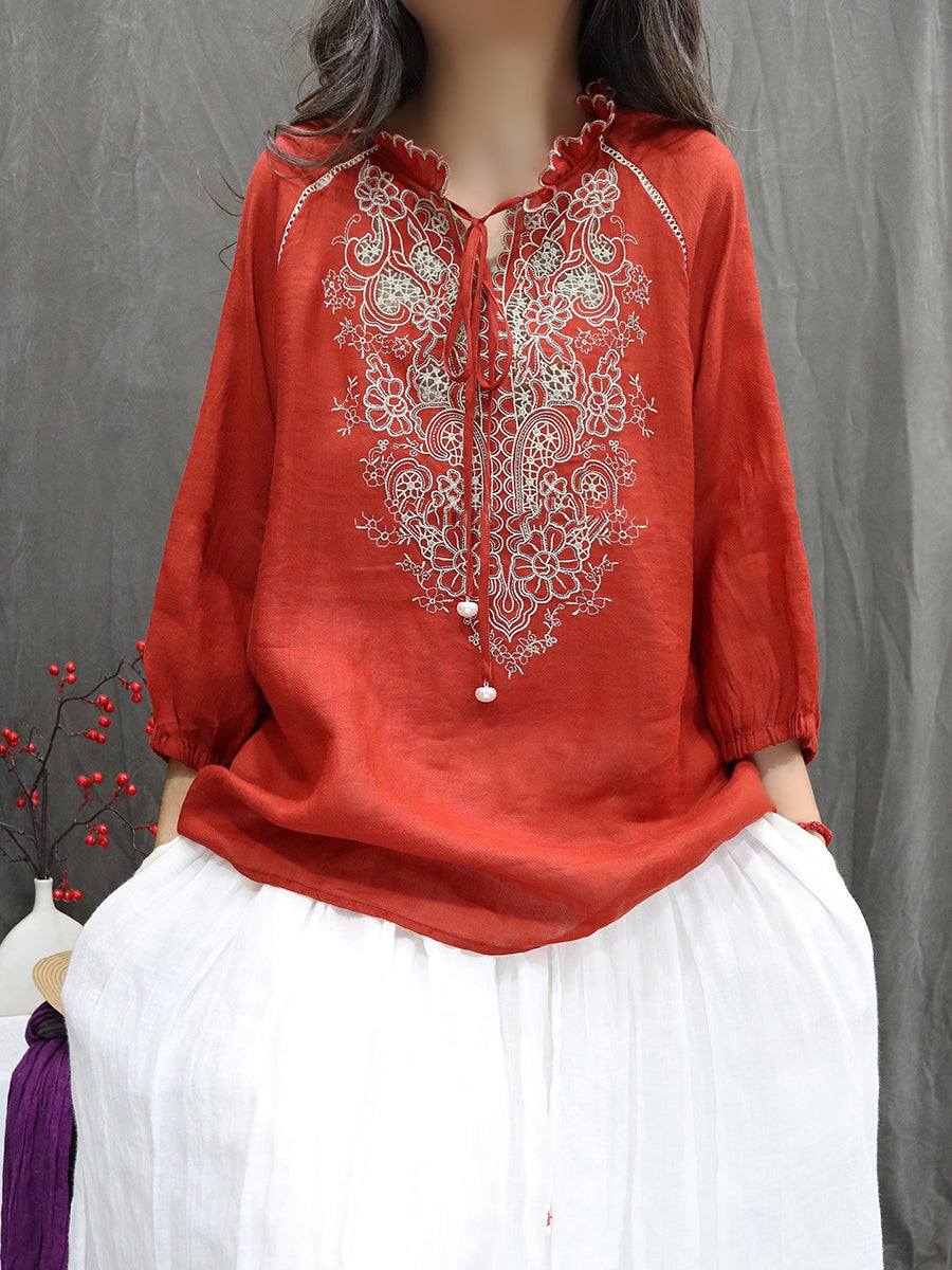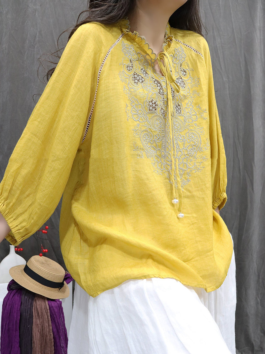 Damenbluse mit Stehkragen und kunstvoller Stickerei aus 100 % Ramie für den Frühling